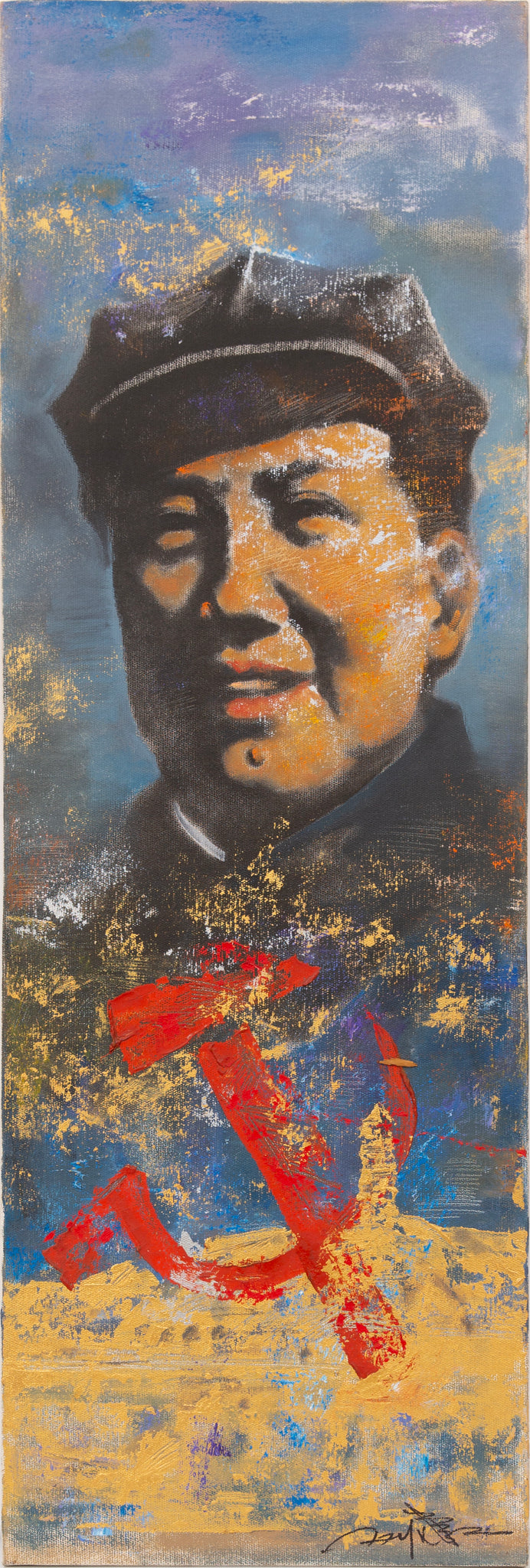 In this compelling portrait Title:d Mao Zedong, Xing Jianjian reimagines one of the most iconic figures of modern China through a fusion of classical realism and bold, expressive abstraction. Painted in a narrow vertical format, Mao’s visage emerges from a luminous, cosmic-blue and ochre background, while a vivid red hammer and sickle symbol dominates the lower canvas. This juxtaposition of realism and painterly gesture invites contemplation on ideological legacy and artistic freedom.