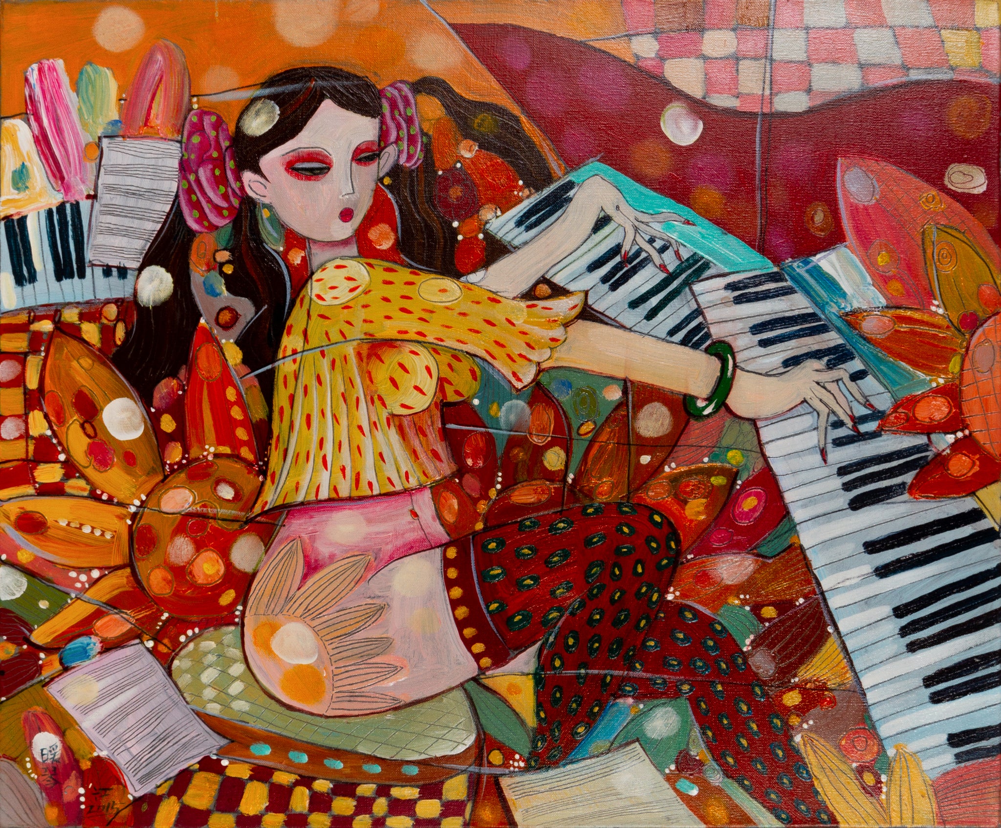Piano Girl is a vibrant and whimsical oil painting that captures a stylized young woman playing piano amidst a swirling, richly colored composition of floral motifs, musical notes, and abstract textures. Jiang Li’s energetic brushstrokes and layered patterns animate the surface with a sense of rhythm and emotion, echoing the theme of musicality embedded within the work.