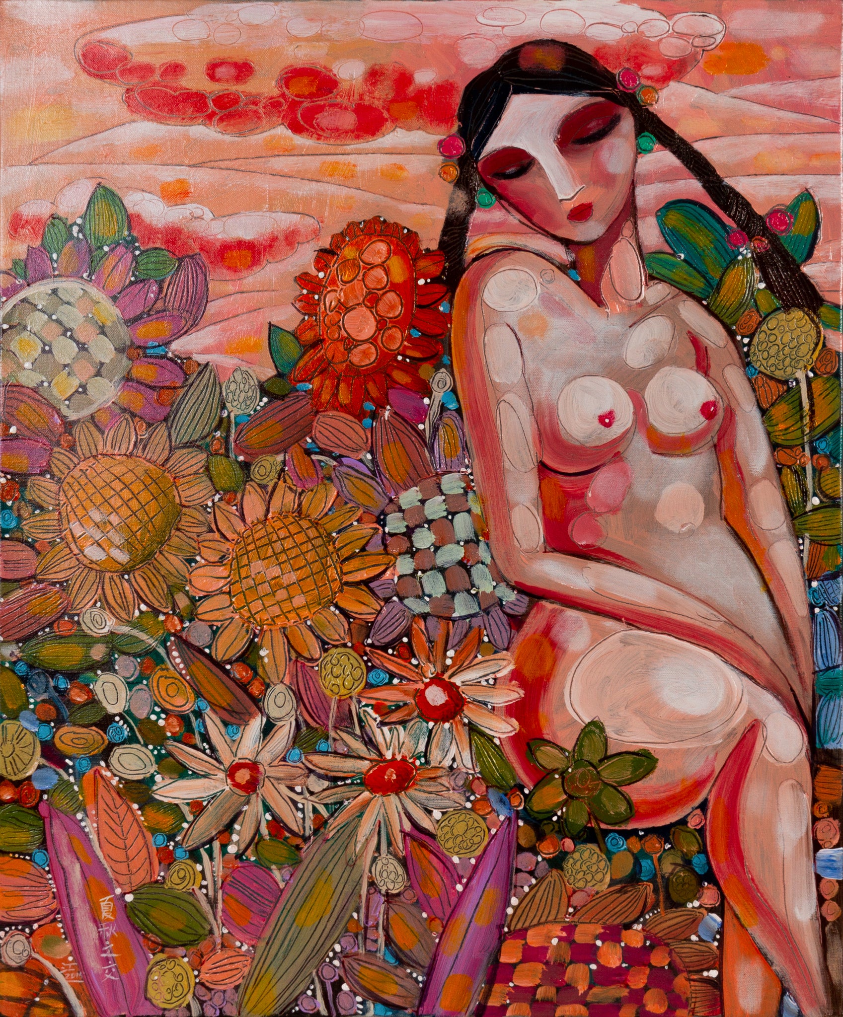 Sunflower is a lush, vividly stylized composition depicting a nude female figure nestled among a kaleidoscopic profusion of oversized sunflowers and blooming flora. With its ornamental detail, vibrant palette, and emotive poise, the painting radiates introspective serenity and symbolic fertility, characteristic of Jiang Li’s richly narrative style.