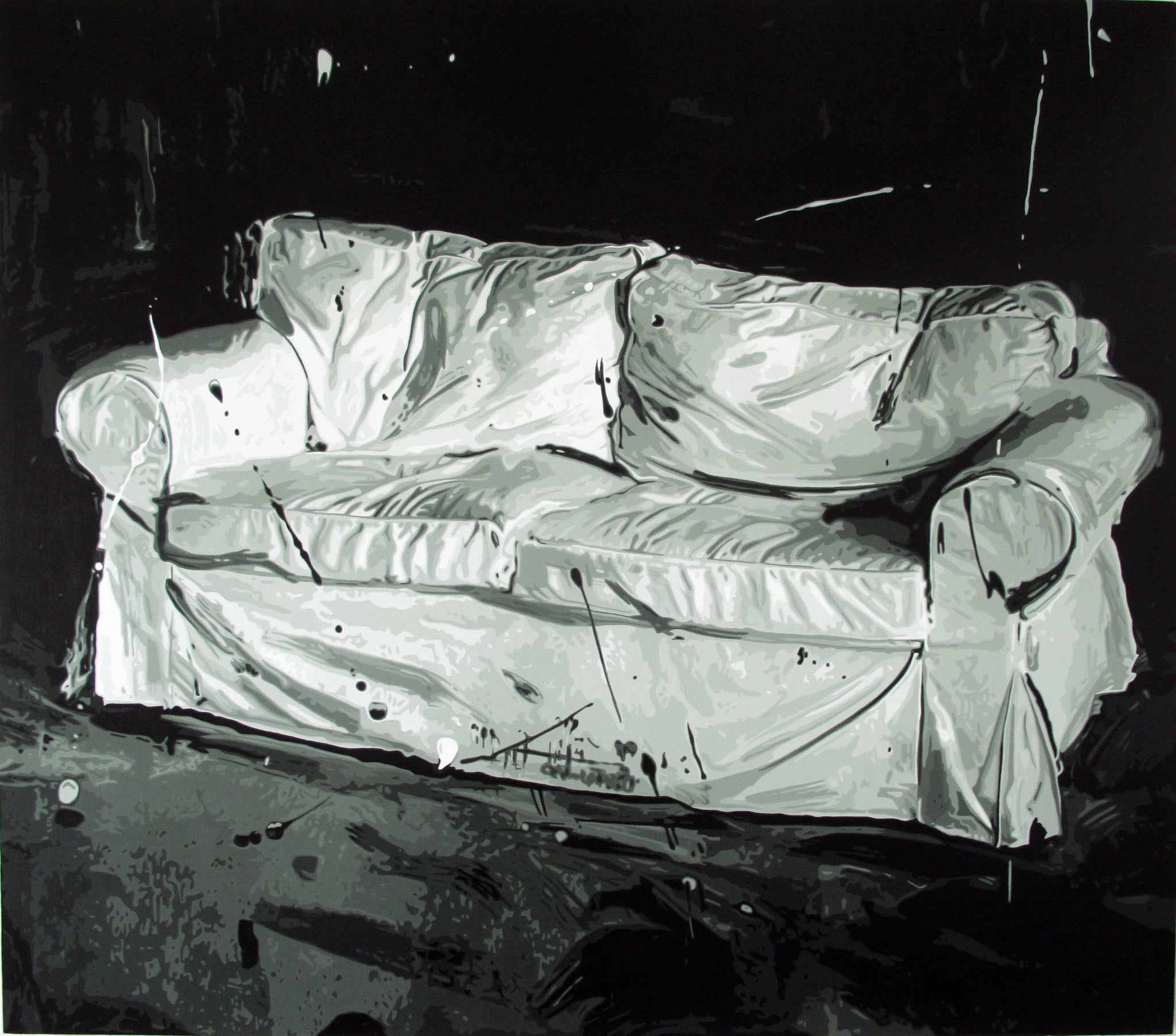 Have a Seat (2012) by Guo Wei is a striking oil on canvas composition featuring a solitary, white-covered sofa rendered in dramatic grayscale tones. The stark contrast and subtle distortions evoke a sense of abandonment and introspection, aligning closely with the artist’s broader thematic concerns.