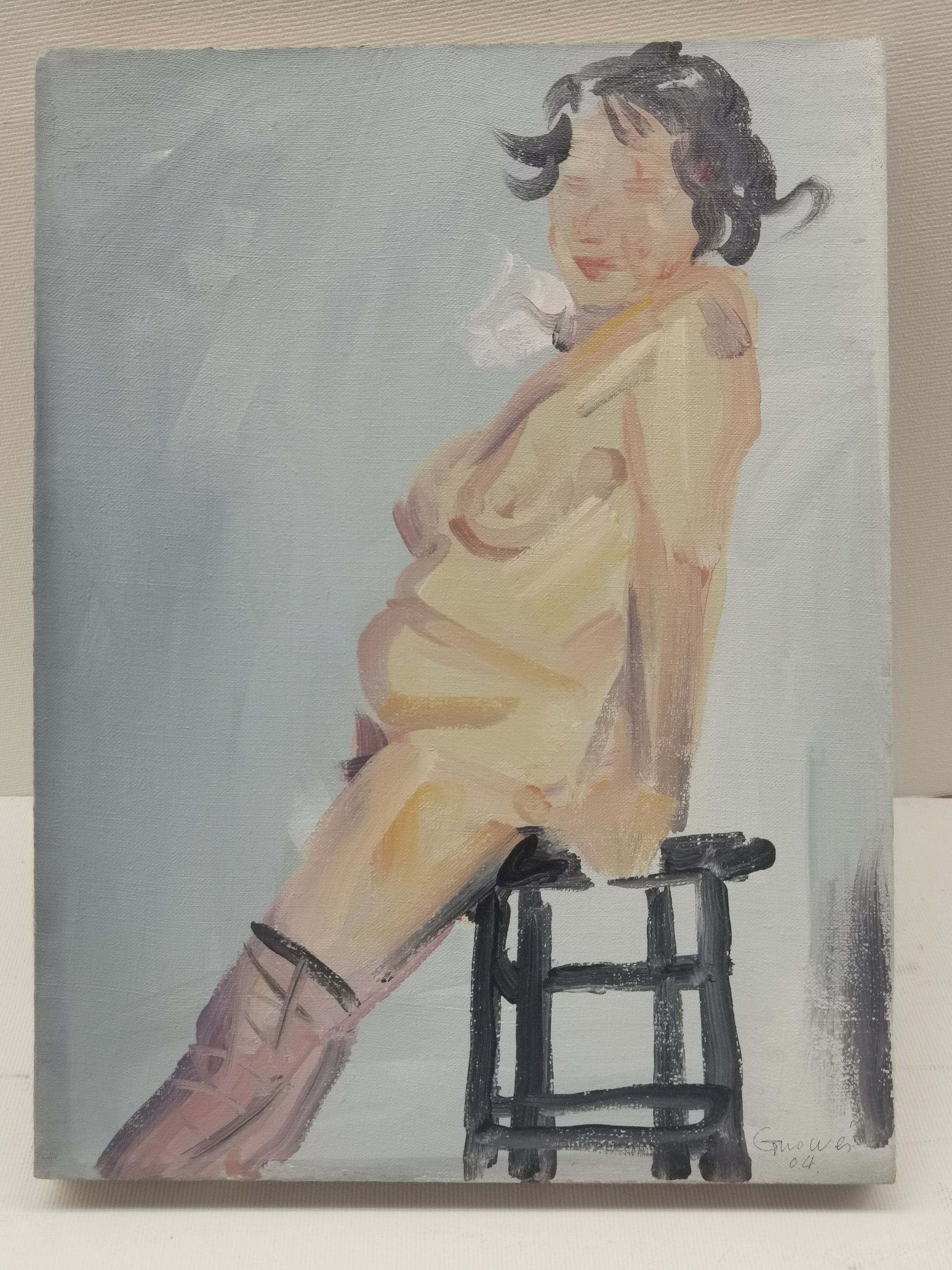 In this 2004 painting Title:d Body, Guo Wei renders a seated female figure atop a backless stool, captured mid-recline with one leg casually extended. The brushwork is loose yet confident, employing a pastel palette of soft peach and dusky mauve against a hazy grey backdrop. The figure’s simplified facial features and dynamic posture suggest both immediacy and ambiguity, embodying the physicality and emotional tension that mark much of Guo’s oeuvre.