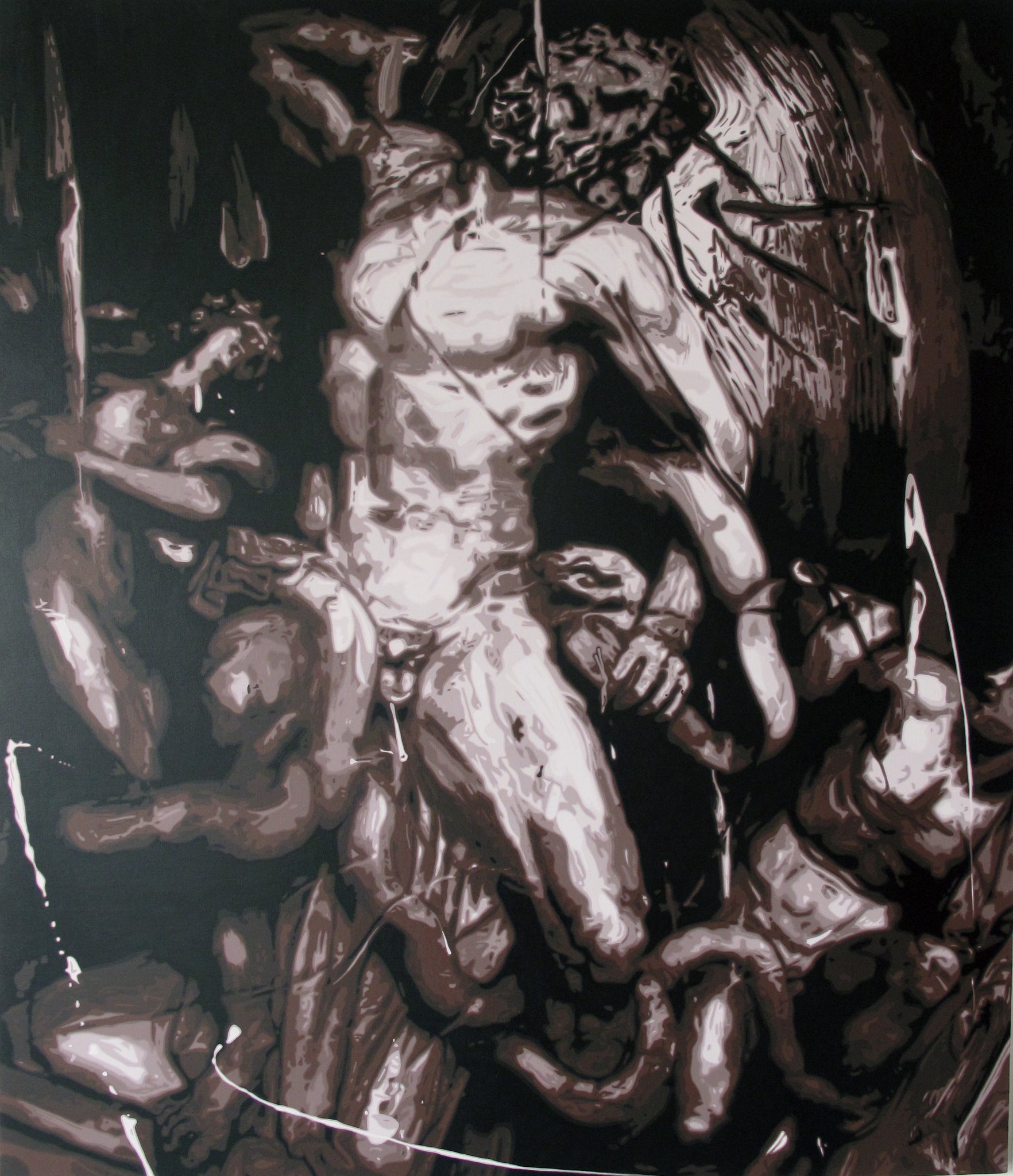 Blind Man by Guo Wei is a monumental oil on canvas composition rendered in a striking monochromatic palette. The central figure, modeled on classical sculpture, is portrayed in a moment of intense physical and emotional tension, with serpentine forms ensnaring his limbs and contorting his posture. Executed with dramatic chiaroscuro and expressive, almost gestural paint handling, the work recalls ancient Greco-Roman forms while reimagining them through a contemporary psychological lens. The sheer scale of the piece commands attention, amplifying its emotional impact.