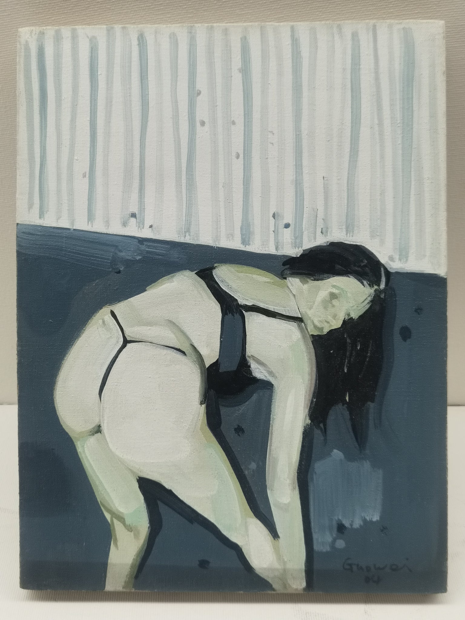 This evocative painting by Guo Wei Title:d Body presents a stark rear view of a solitary female figure bending forward in black undergarments, set against a minimalistic interior backdrop. The artist uses thick brushwork, subdued tones, and raw spatial contrast to evoke emotional unease and psychological intensity.