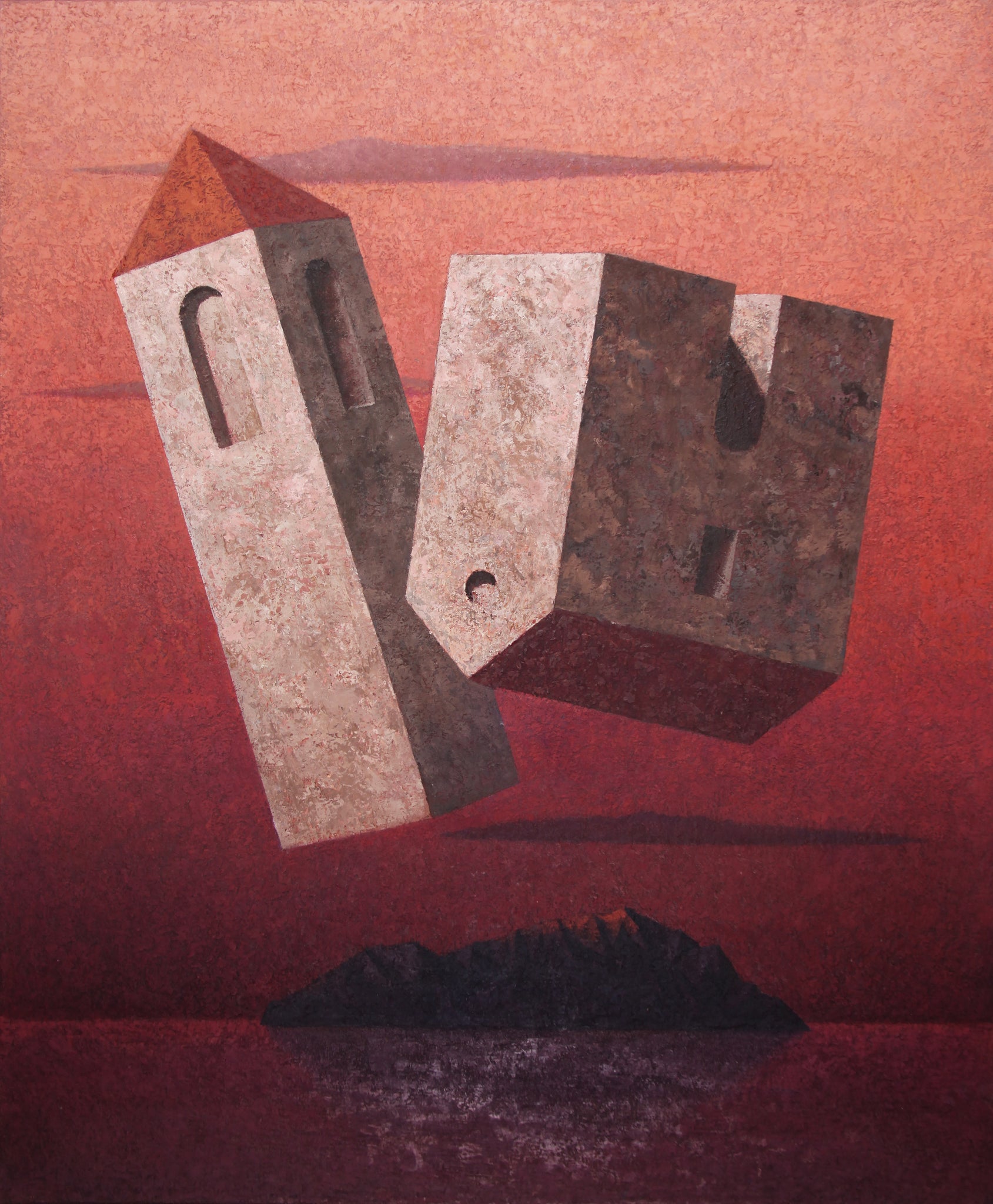 In Isola Felice (2011), Matthias Brandes presents a gravity-defying vision of architecture adrift in a twilight sky. Executed in oil and egg tempera on canvas, the composition features two angular, chapel-like buildings floating above a darkened island, their pale stone facades rendered in meticulous texture against a saturated crimson backdrop. This surreal staging, simultaneously monumental and weightless, is emblematic of Brandes’ deeply imaginative and symbolic visual language.