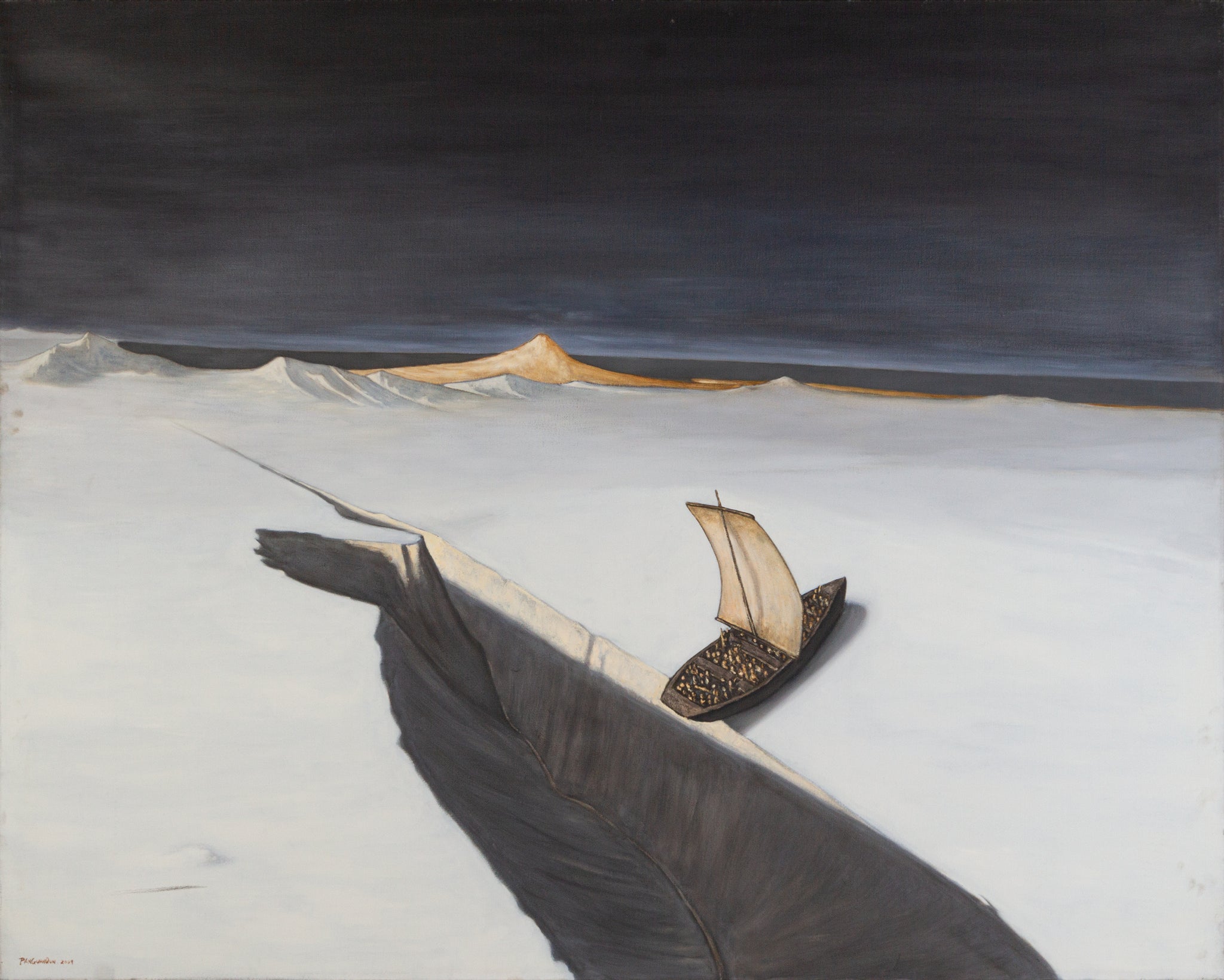 In Strayed into Fairy Hill 1, Pan Guanqun presents a haunting maritime journey across an austere white expanse that evokes both snow and emptiness. A solitary sailboat, packed with indistinct figures, edges perilously along a black crevasse that cleaves the landscape, its trajectory unclear. A distant peak, faintly gilded by light, offers the only visual warmth in this otherwise stark scene.