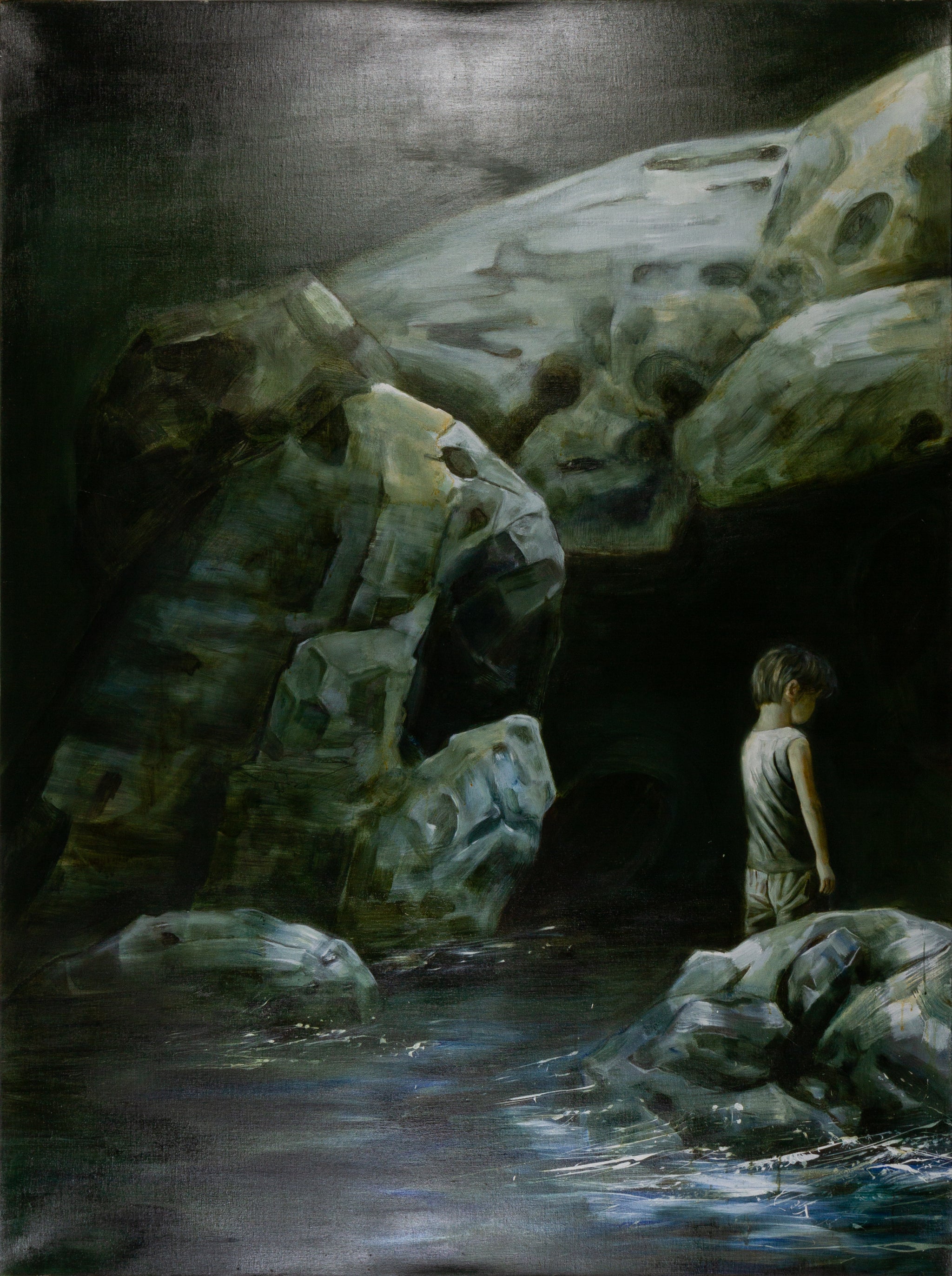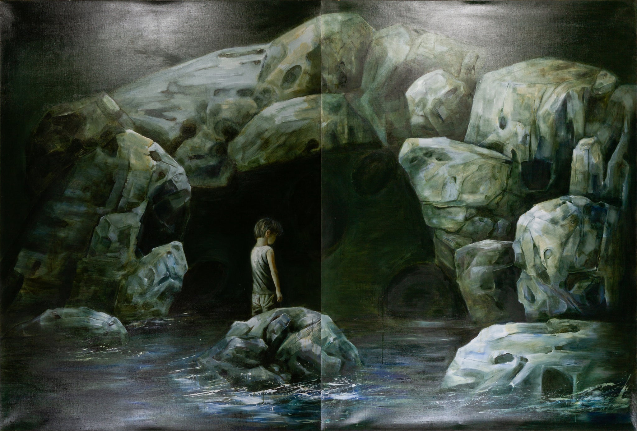 This monumental oil on canvas diptych by Peng Jianzhong, Sou-shen Ji 1 – Pan Silk Cave, presents a haunting and enigmatic composition. Dominated by cavernous rock formations and subdued tones, the central figure of a young boy stands isolated amid jagged stone and reflective waters. The work's immersive scale and cinematic framing evoke both a dreamscape and a psychological terrain, inviting viewers into a liminal space between myth and memory.