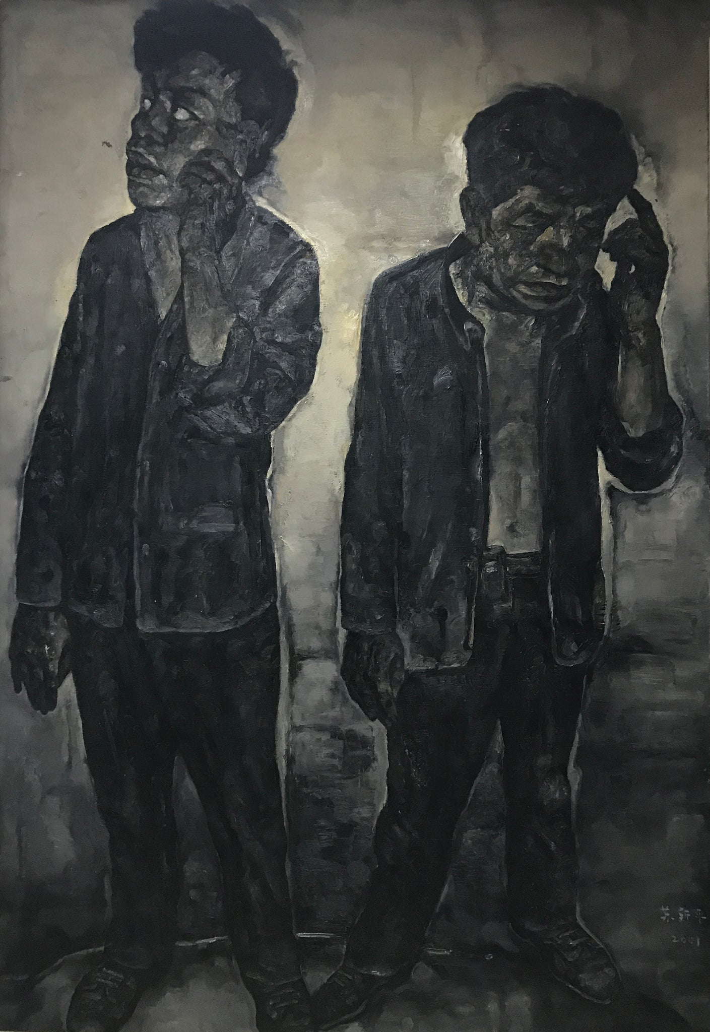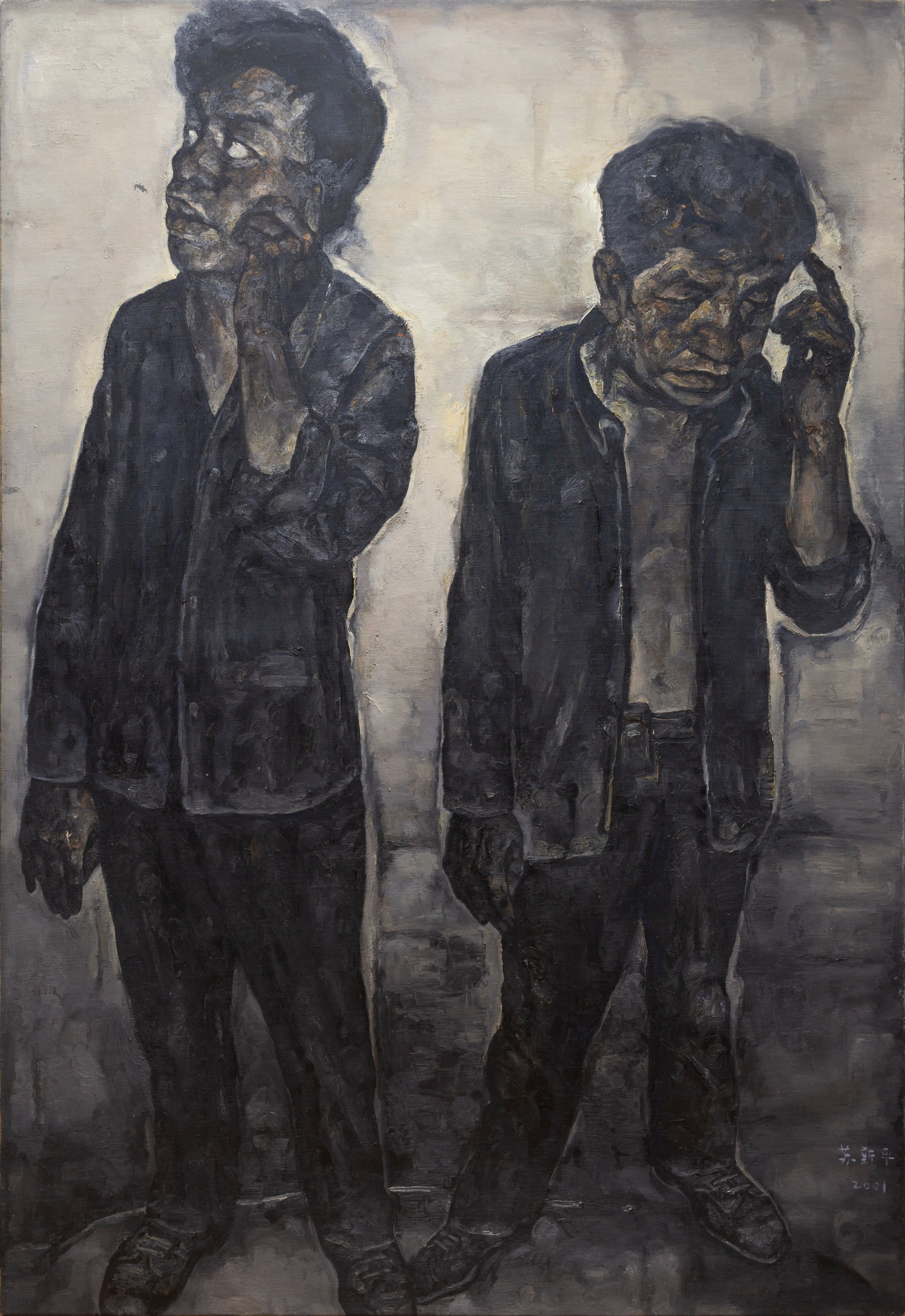 Urban Landscape is a large-scale oil on canvas by Su Xinping, notable for its subdued palette and emotionally charged figurative style. Measuring 139 by 202 centimeters, the composition features a full-length portrait of two male figures rendered in muted grayscale. The two men stand side-by-side, their expressions solemn and introspective. Each displays subtle yet striking gestures—one touching his forehead, the other concealing part of his face—imbuing the work with a quiet psychological intensity. The background dissolves into soft monochrome tones, anchoring the figures within a seemingly undefined, urban atmosphere.