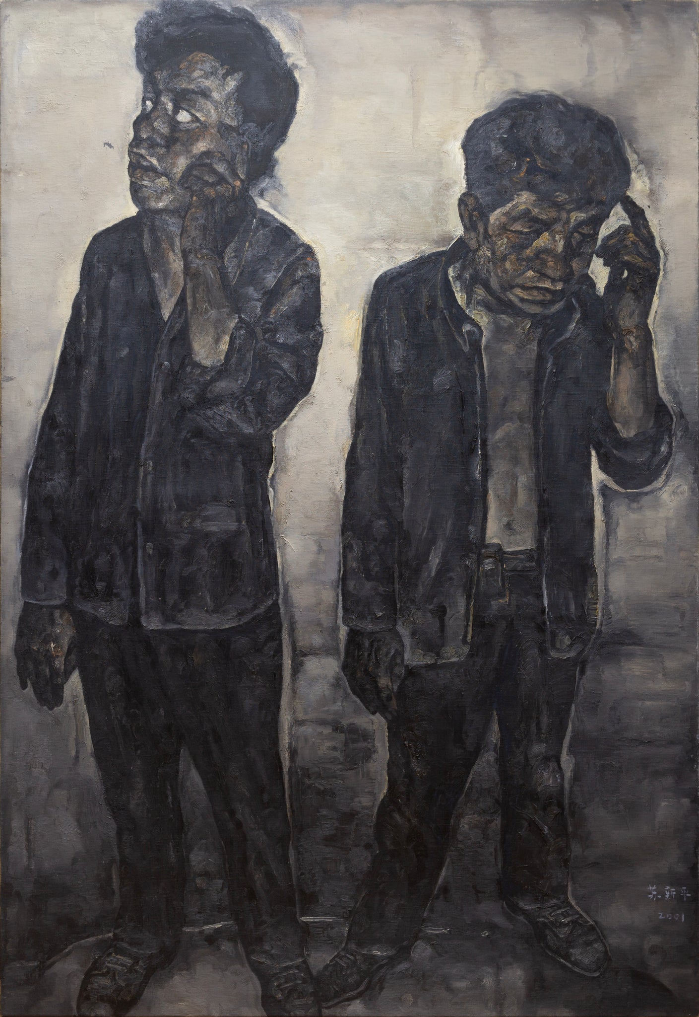 Su Xinping’s work is widely recognized for its exploration of psychological depth within stark, often desaturated environments. This piece reflects a mature development of his figurative language: blending elements of social realism with a minimalist, existential aesthetic. The soft-focus, tonal quality evokes both German Neue Sachlichkeit portraiture and aspects of traditional Chinese ink wash sensibility—flattened spatial depth, controlled emotion, and visual restraint. The emotional subtlety within the figures suggests an affinity with Lucian Freud’s confrontational intimacy, filtered through a distinctly Chinese cultural and political lens.