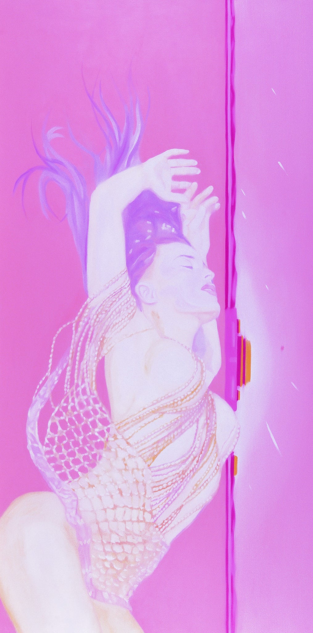 In Revolution of Chinese Culture Part III, Yang Mian presents a commanding, hyper-stylized portrayal of a female figure wrapped in cascading strands of pearls, suspended in a state of ecstasy or liberation against a saturated pink backdrop. Executed in oil on canvas, this large-format composition exemplifies Yang’s meticulous brushwork and atmospheric palette, with subtle transitions between glowing flesh tones and misty pastels.