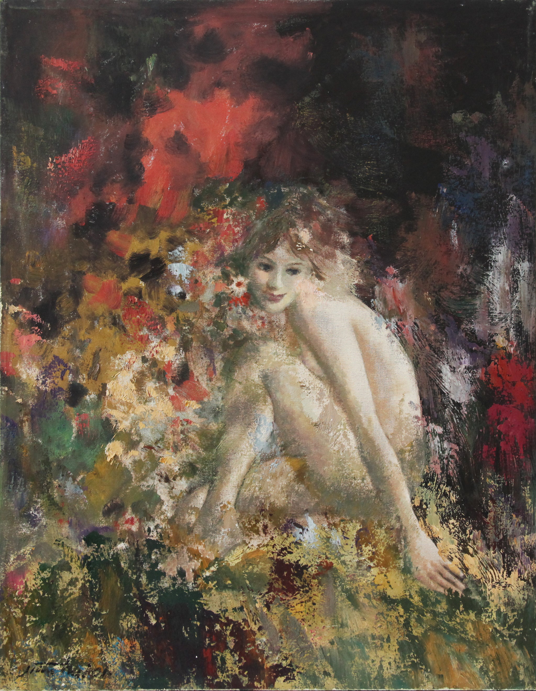 Pure is an evocative oil painting by Ren Jianhui that captures a seated nude figure nestled within a lush, expressionistic garden. The composition is infused with warmth and intimacy, with the figure’s soft, contemplative expression emerging gently from a field of vibrant, dappled color.