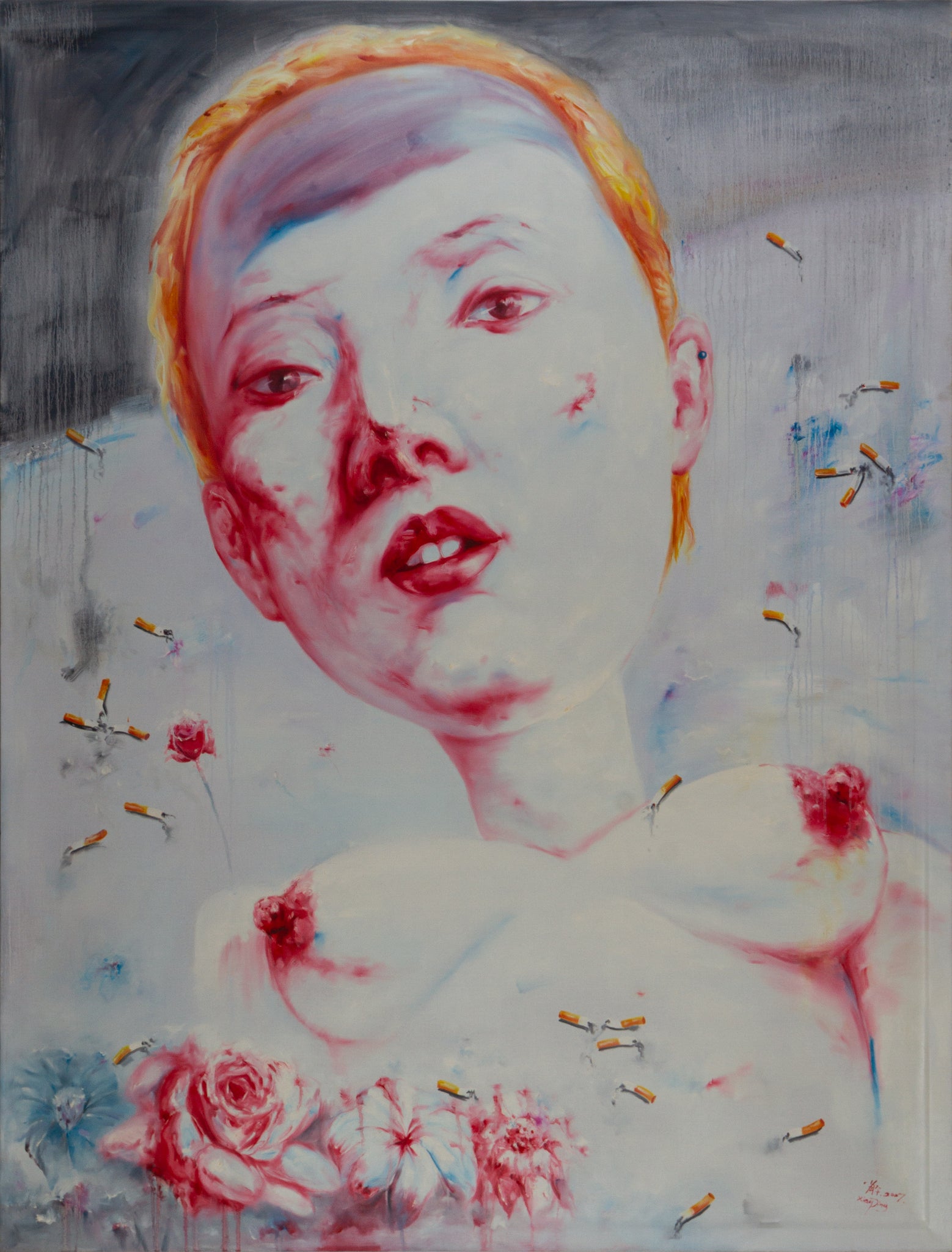 Xiao Ping's work straddles the emotive sensibilities of post-Socialist Chinese contemporary painting with a hyperrealist yet dreamlike aesthetic. Drawing upon a palette of faded flesh tones, bruised reds, and surgical whites, he invokes both the psychological unease of Zhang Xiaogang’s bloodline portraits and the fleshy theatricality of Lucian Freud’s figuration. The surreal scattering of cigarette stubs disrupts the portrait’s beauty, positioning the work within a visual vocabulary of disquiet and postmodern critique.