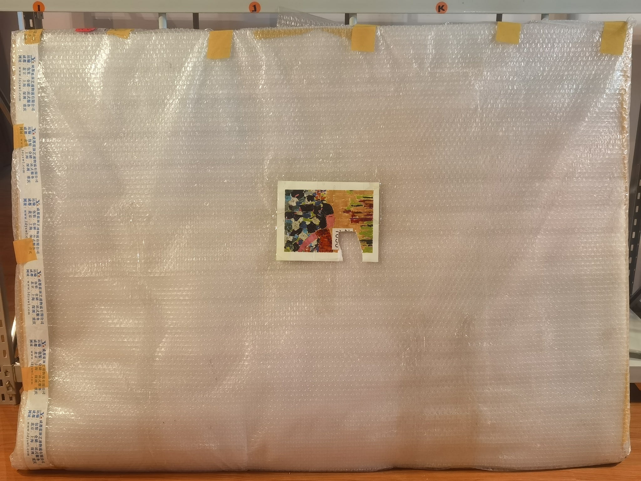 The work is in very good condition. Yan Bo’s deliberate use of impasto and mineral materials results in a richly textured surface with intentional craquelure and layered buildup. There is no evidence of restoration or structural issues; the integrity of the canvas and paint surface remains intact.