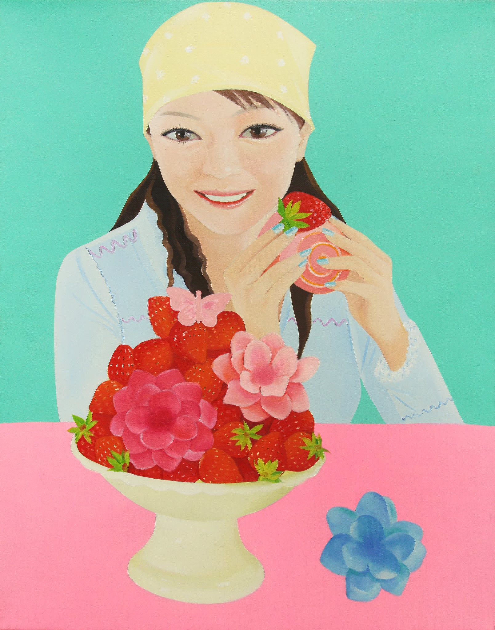 Strawberry Cake by Yang Fan is a vibrant and meticulously rendered oil on canvas, depicting a smiling young woman with a yellow kerchief, holding a lollipop and a strawberry, while seated behind an ornate bowl overflowing with strawberries and stylized flower blossoms. With its pastel palette and precise detailing, the painting presents an image of cheerful femininity steeped in youthful exuberance. Executed in 2005, the work measures 100 by 80 cm and exemplifies Yang’s signature clean lines and smooth surfaces.