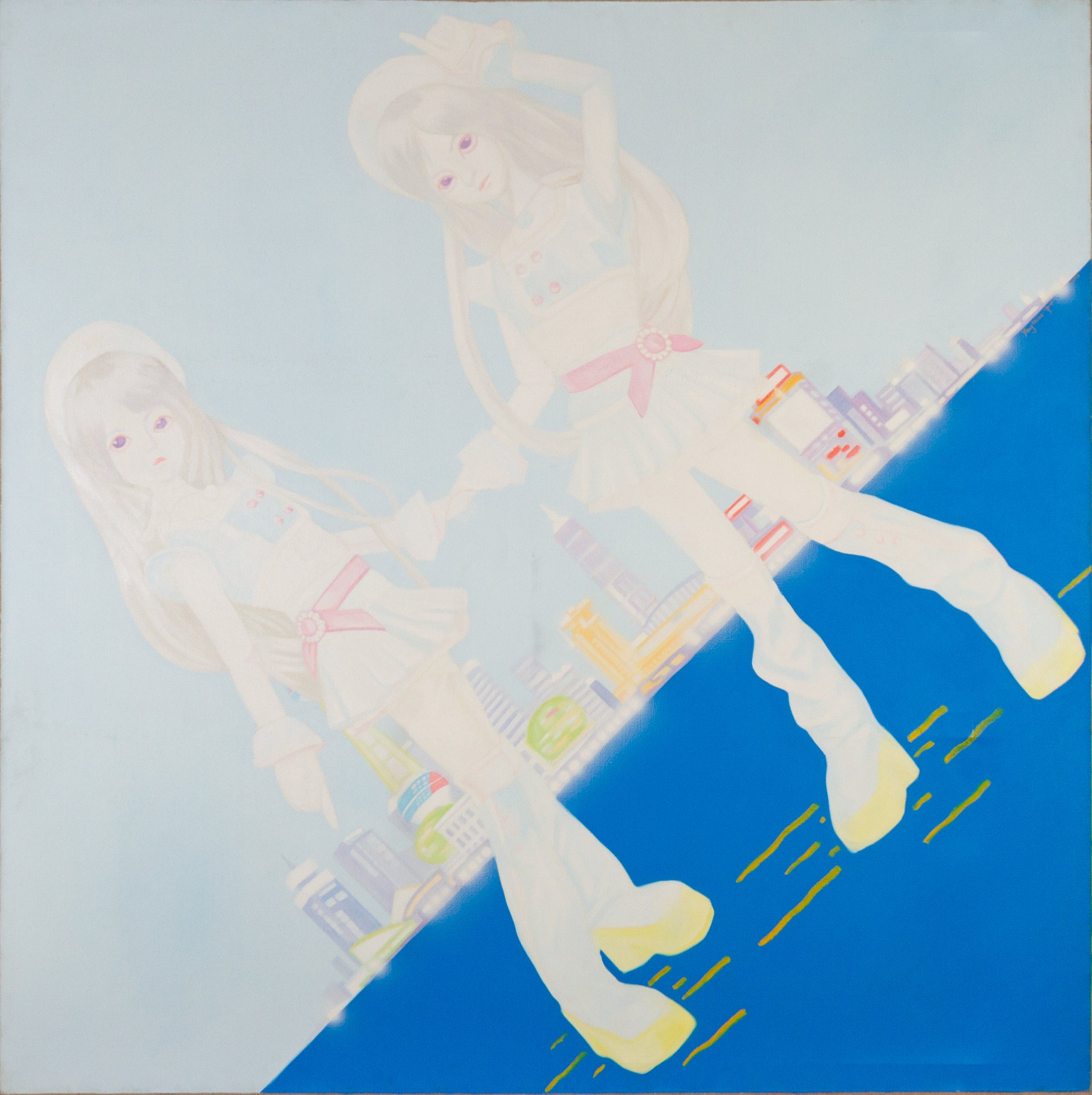 Revolution in Chinese Culture XVI is a large-scale oil painting by contemporary Chinese artist Yang Mian. Measuring an imposing 200 x 200 cm, the work depicts two ethereal, anime-like female figures dressed in stylized sailor uniforms—delicately outlined in pale pastel hues—towering above a stylized urban landscape that references contemporary Chinese cityscapes. The background angles steeply, suggesting a disorienting shift in visual perspective, while the bright cyan lower half reinforces a dreamlike detachment from reality.