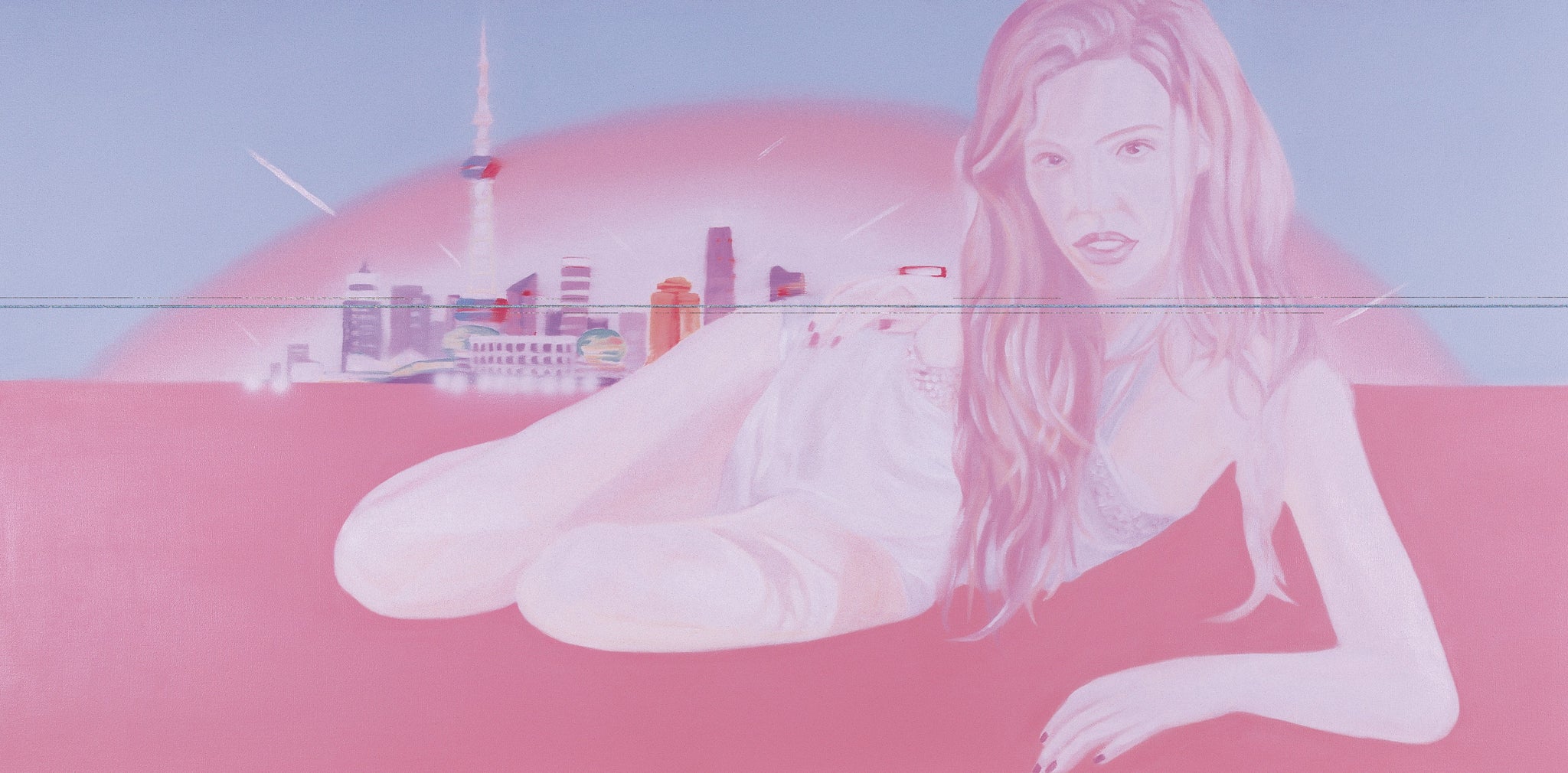 Yang Mian's Fourth Welcome, China Culture Revolution No. 4 is a striking horizontal oil painting that juxtaposes a hyper-stylized reclining female figure with a pastel-toned, futuristic urban skyline. Executed in a limited palette dominated by pale pinks and cool blues, the composition reflects the synthetic clarity of media imagery. The female figure, posed provocatively in lingerie, hovers in front of an exaggerated backdrop that includes idealized Chinese architecture and glowing city lights, anchoring the narrative in fantasy and desire.