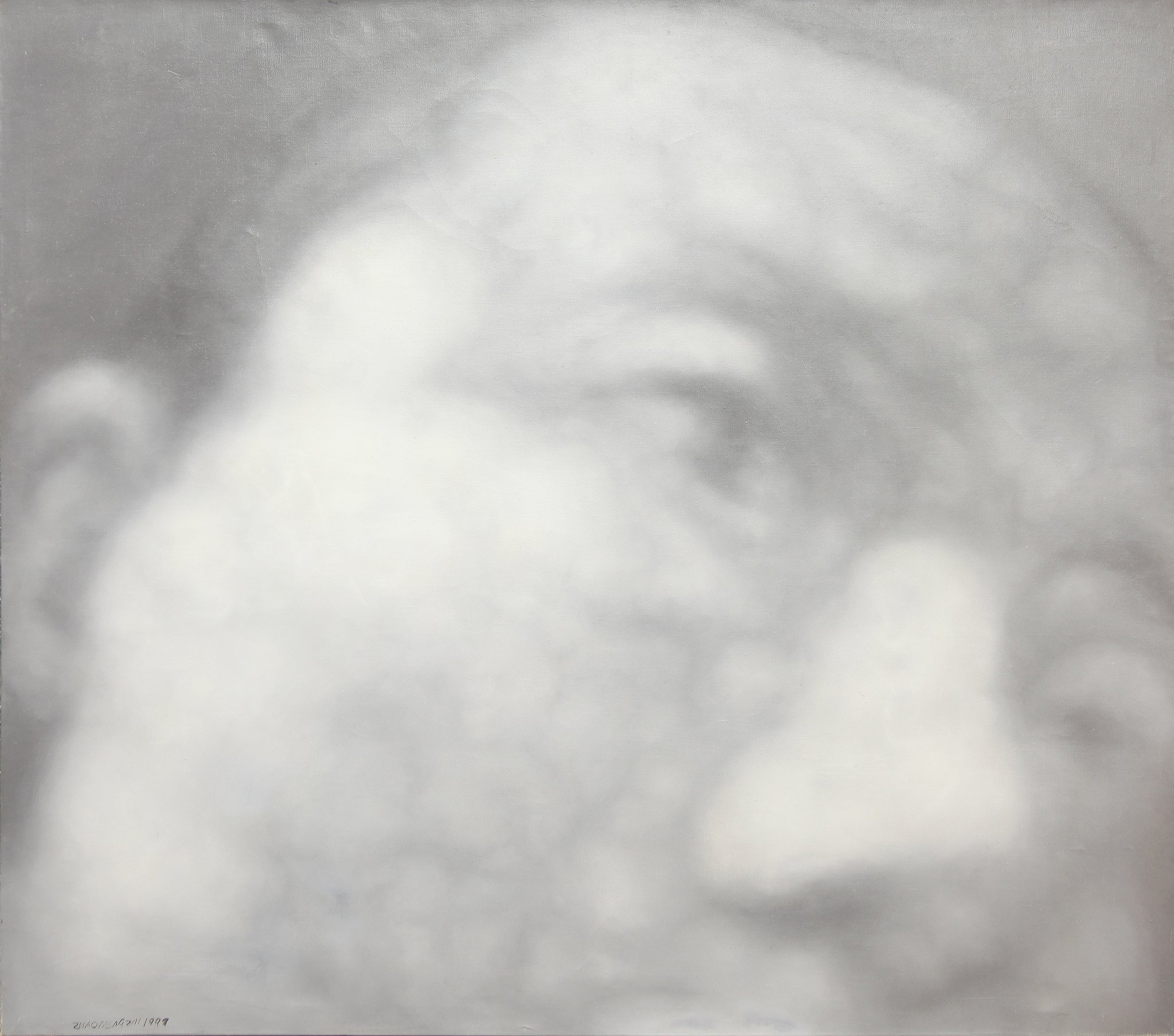 Facial Expression 1999 No. 24 is a hauntingly blurred monochromatic portrait by Zhao Nengzhi, a pivotal figure in post-1990s Chinese painting. Rendered in soft greyscale oil on canvas, the work offers an extreme close-up of a human face — indistinct, vaporous, almost dissolving into its own texture. The lack of sharp contours and the heavy atmospheric haze emphasize not the individual identity of the subject, but the emotional residue embedded in expression itself. The face feels suspended in time, caught in a moment of psychological intensity.
