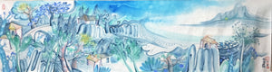 Early Spring Bloom is an expansive and dreamlike scroll painting by Lv Jiang, capturing a serene riverside village as nature awakens into spring. Soft blue and green washes dominate the palette, harmonizing the architectural elements—arched bridges, winding pavilions, and clustered dwellings—with the surrounding organic landscape.