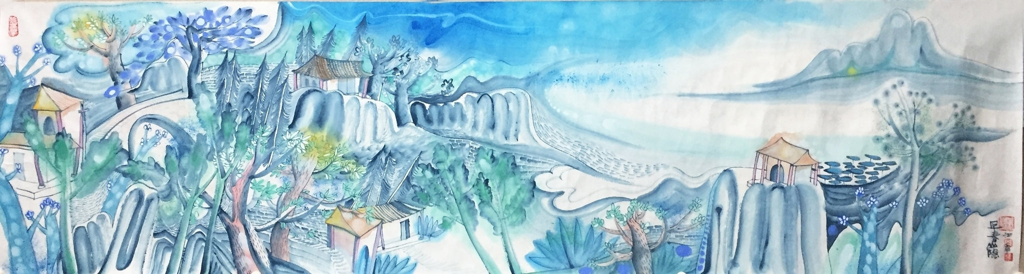 Drawing upon the lyrical traditions of Chinese landscape painting (shan shui), Lv Jiang breathes new life into classical motifs with expressive, curvilinear brushwork and delicate color gradients. His composition floats between reality and imagination, blending modern fluidity with time-honored pictorial conventions of depth, rhythm, and perspective.