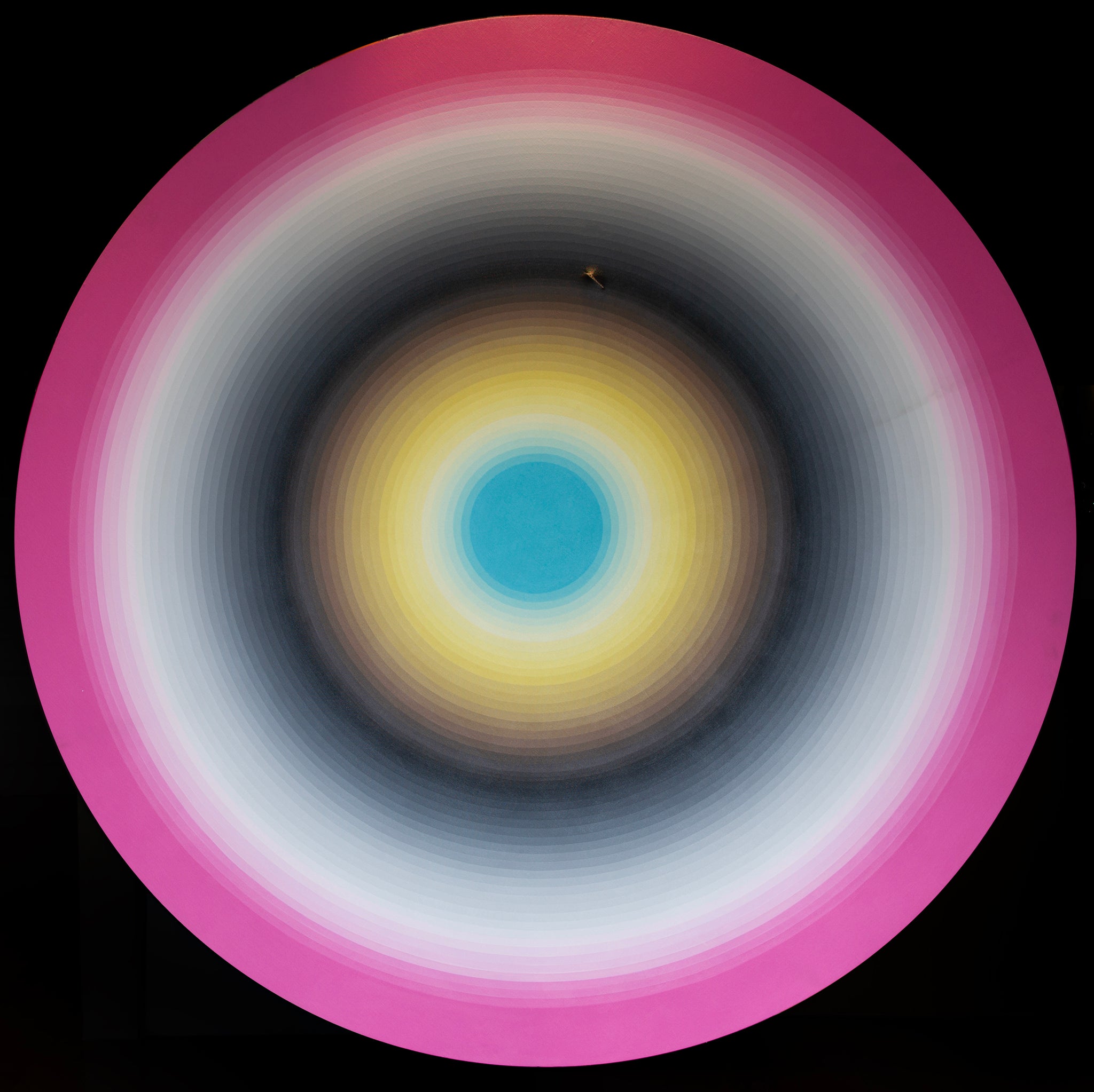 Color Wheel is a monumental circular oil painting by contemporary Chinese artist Yan Lei. Measuring 210 centimeters in diameter and presented framed, the work displays a series of concentric color bands arranged in harmonious gradients. Dominated by soft hues of pink, gray, white, and black, the palette culminates in a vibrant central disc of yellow and turquoise. The flawless transitions between tonal zones generate a sense of radial movement and chromatic depth. The work is minimalist in its structure, yet visually magnetic, commanding the space with serene intensity.