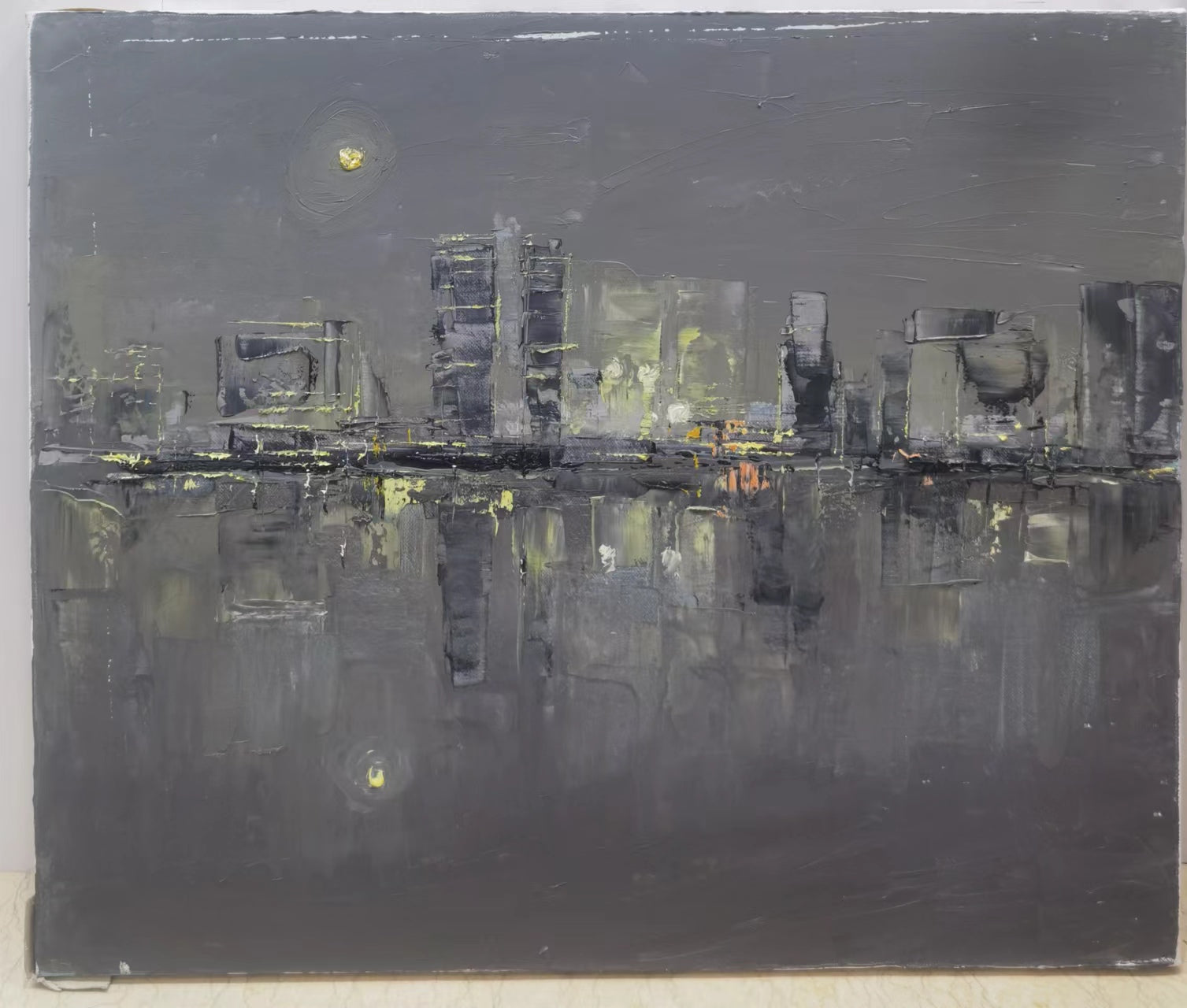 Baijia Lake Never Sleeps City (2016) by Wei Luning presents a moody, impressionistic cityscape that captures the illuminated skyline of an urban environment at night. Executed in oil on canvas, the painting is dominated by rich tonal greys and punctuated with dashes of yellow and orange light, evoking the subtle glimmers of windows and streetlights reflected in the still water below. The scene suggests the contemporary skyline near Baijia Lake, rendered with expressive brushstrokes and a softened, almost dreamlike abstraction.