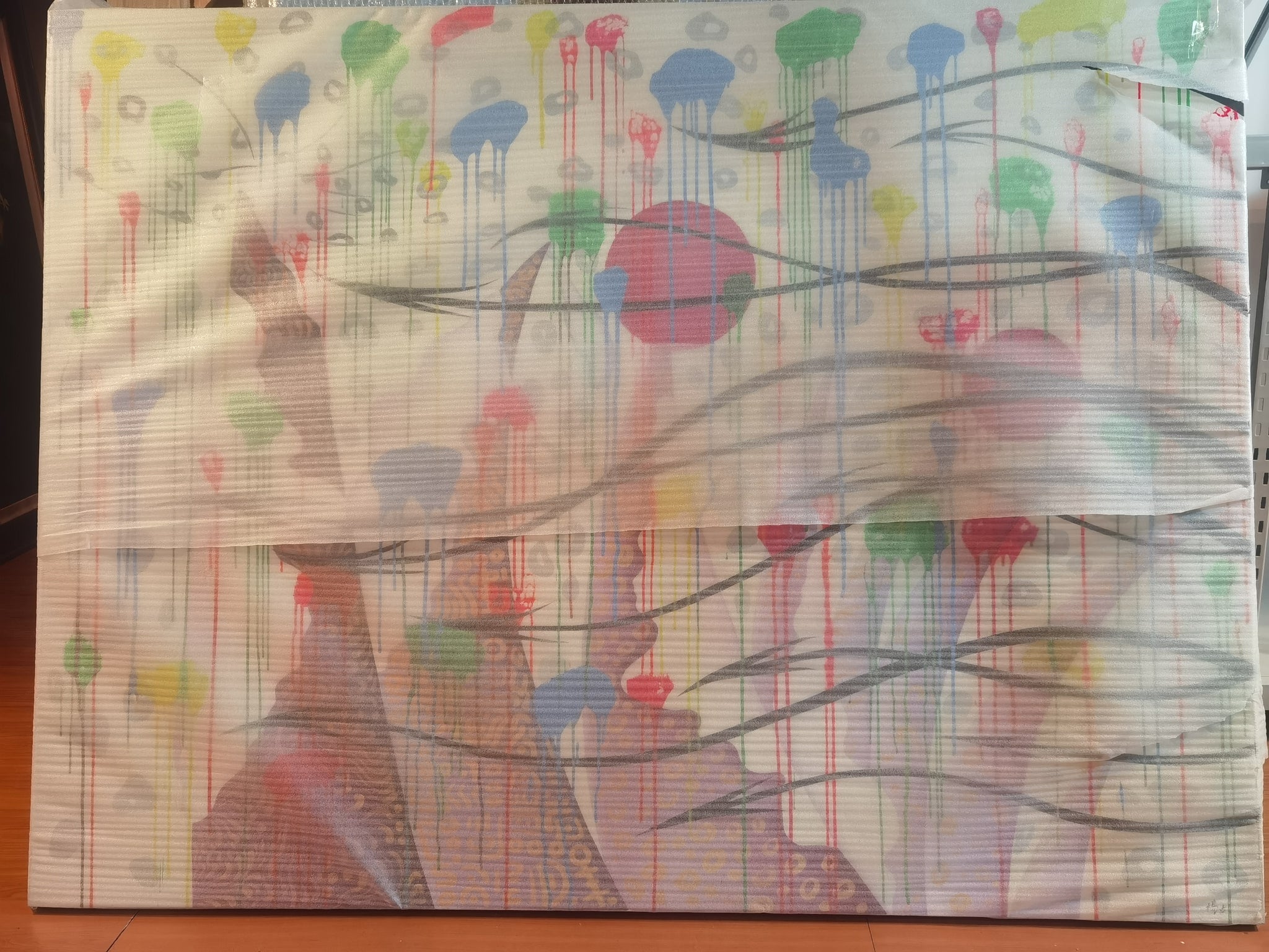 The artwork is in very good condition. The paint surface is stable and vibrant, with no visible losses, abrasions, or signs of restoration. The canvas remains taut and well-preserved, with the dripping effects and layered textures intact.