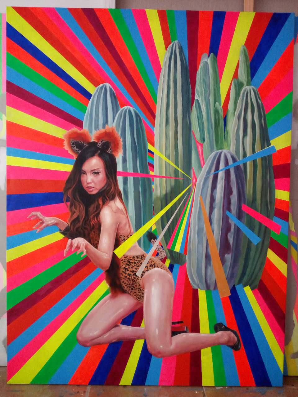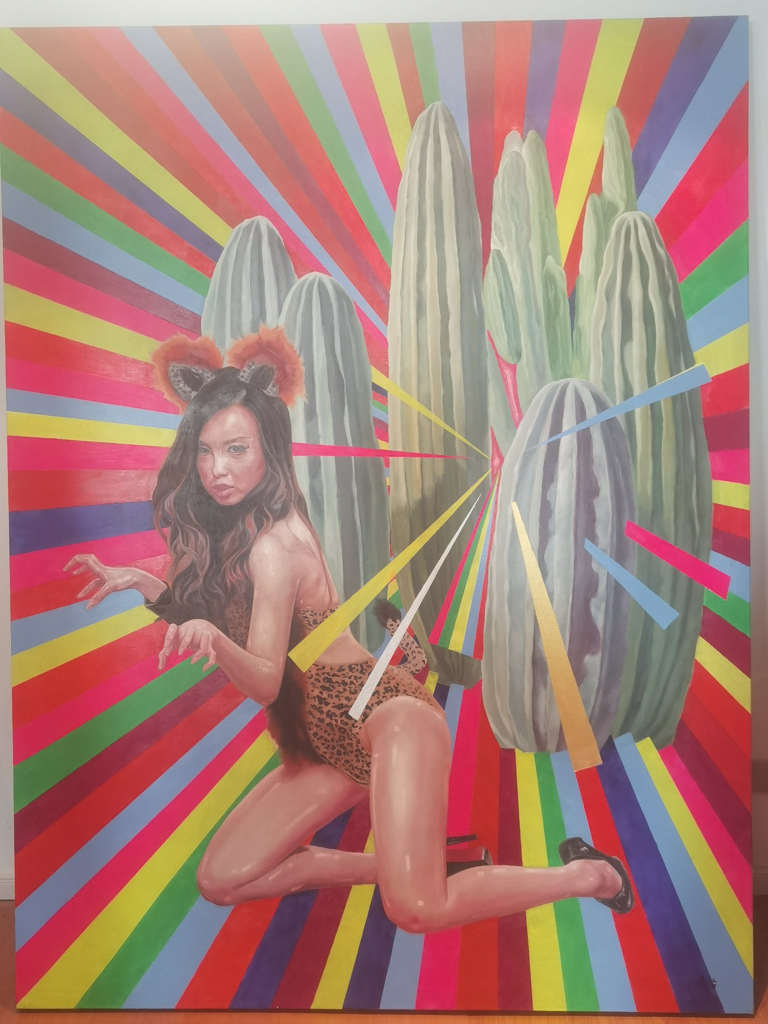 Zhan Yang’s work in this piece straddles photorealism and pop surrealism, merging painterly finesse with dazzling, high-impact chromatic design. The central figure’s lifelike rendering contrasts with the near-psychedelic flatness of the surrounding rainbow rays and stylized cacti, invoking comparisons to Jeff Koons, Takashi Murakami, and Yue Minjun. The erotic playfulness of the subject is infused with ironic detachment, characteristic of post-1980s Chinese contemporary art’s engagement with consumerism, identity, and spectacle.