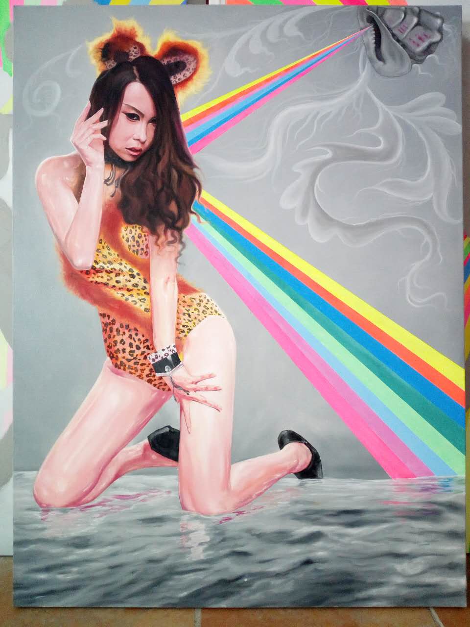 In Part Two (2016), Zhan Yang presents a theatrical and satirical vision of femininity and spectacle. A woman in a leopard-print bodysuit kneels atop a shimmering reflective surface, her figure hyper-realistically rendered. Behind her, multicolored beams shoot from a stylized cloudlike form resembling a divine mouthpiece, cutting diagonally across a minimalist gray background. The woman's cat ears, bracelet, and assertive pose combine to parody themes of fantasy, performance, and sexualized identity.