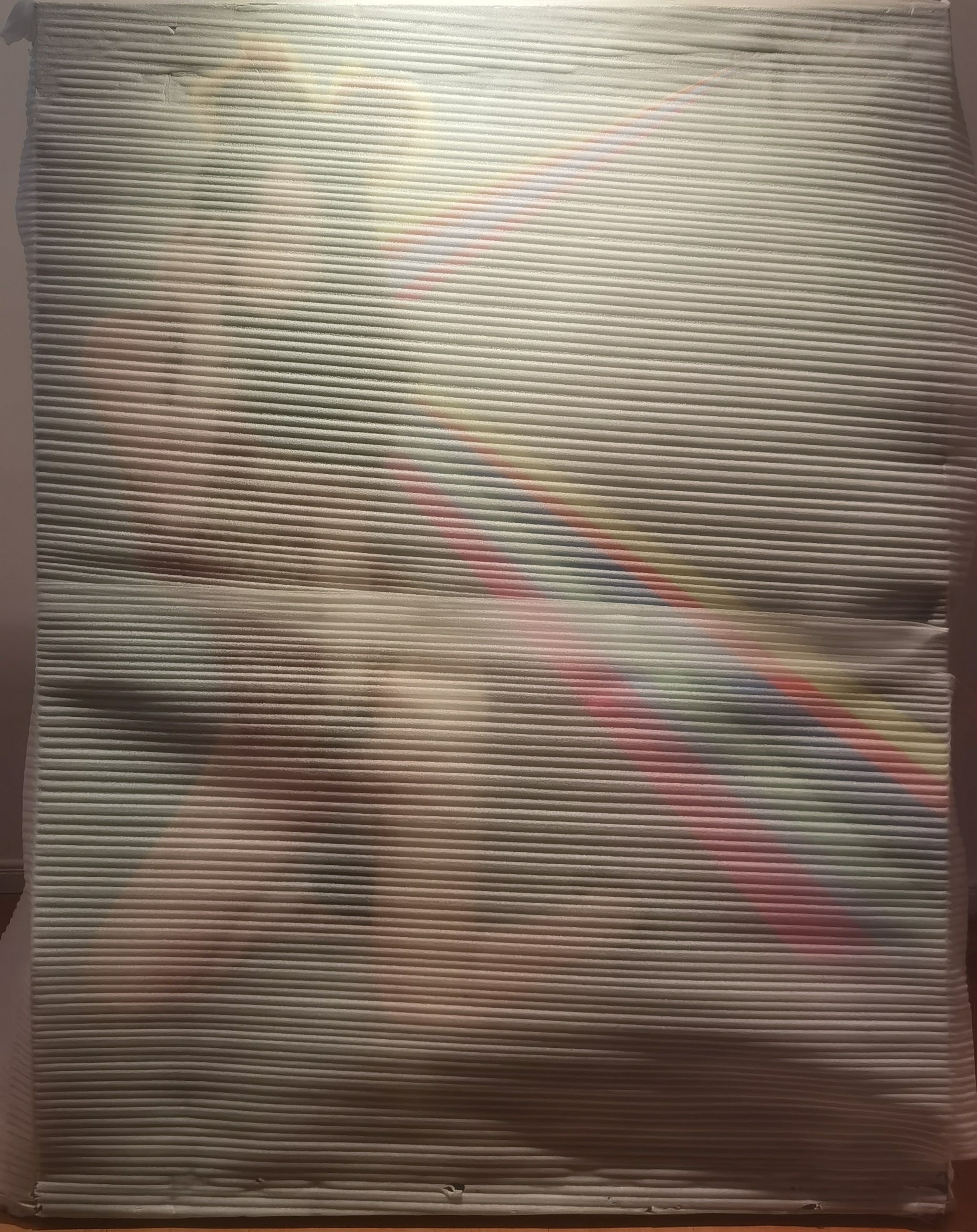 The painting masterfully blends hyperrealism with pop surrealism and visual iconography reminiscent of fashion photography. Zhan Yang fuses Western glamour with Eastern theatricality, using rainbow color rays and detailed brushwork to evoke the work of David LaChapelle and Pierre et Gilles, while retaining the critical edge found in Chinese Cynical Realism. The polished surface and bold palette underscore the tension between sincerity and spectacle, kitsch and critique.