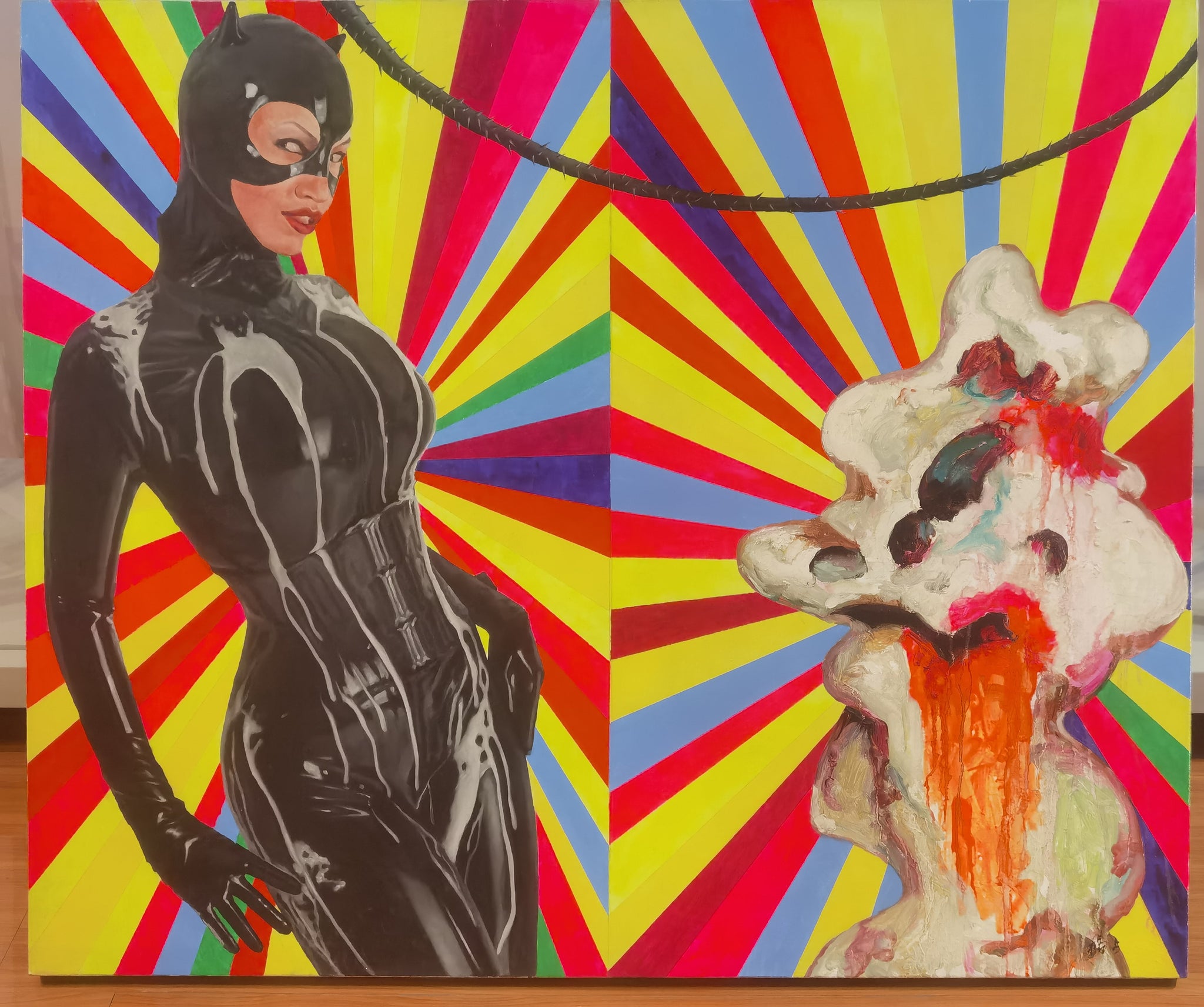 Zhan Yang’s Catwoman/Spring Bud Look at the Movie (2016) juxtaposes pop culture and abstraction in a dynamic composition divided into two halves. On the left, a hyper-stylized rendition of Catwoman—draped in glossy black latex—strikes a confident pose. On the right, a grotesque, organic form evocative of a melting rock or mutated coral confronts her. Both figures are framed by vibrant radial bursts of neon color, intensifying the surreal contrast between comic-book seduction and biomorphic distortion. The black rope traversing the top edge unites the composition into a tense theatrical tableau.