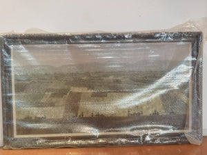 In Seven Star Dam Three, Hou Baochuan captures an expansive aerial view of cultivated fields stretching toward a distant misty mountain range. Rendered in carefully layered oil pigment, the mosaic of plots—each in subtle tones of green, ochre, and sienna—creates a lyrical harmony of geometric abstraction and rural topography. Rows of trees serve as rhythmic punctuation across the vast composition.