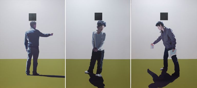 Although Wang Jianwei is internationally recognized for his work in installation, performance, and time-based media, Messager No.10 illustrates his parallel commitment to the painted surface as a field of critical thought. His brushwork is gestural yet exacting, combining abstraction with oblique figuration. The aesthetic recalls aspects of the post-Conceptual and Neo-Expressionist traditions, but it is unmistakably informed by his personal engagement with China's shifting cultural identity. The layered spatial logic of the triptych format evokes the nonlinear syntax of theater and film—mediums integral to Wang's broader practice.