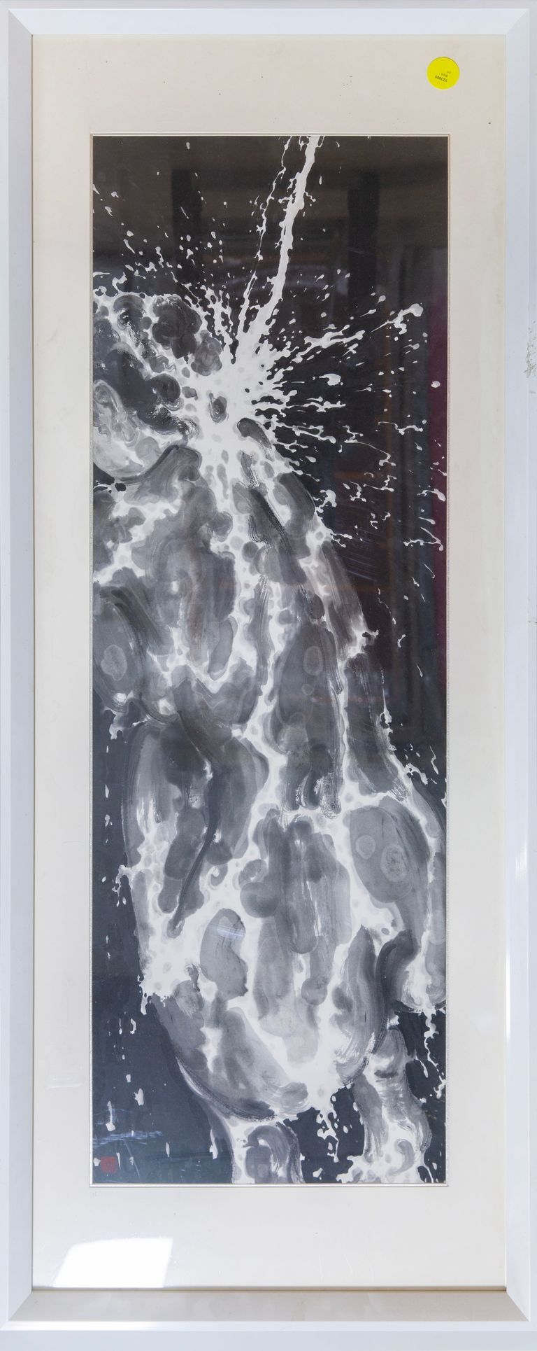 In Landscape, artist Tan Leiming transforms a traditional ink painting into a dramatic exploration of movement and energy. Executed in dynamic monochrome, the composition evokes the explosive force of a natural phenomenon—possibly a waterfall, volcanic eruption, or an abstracted storm—captured in the immediacy of expressive brushwork and splattered ink.