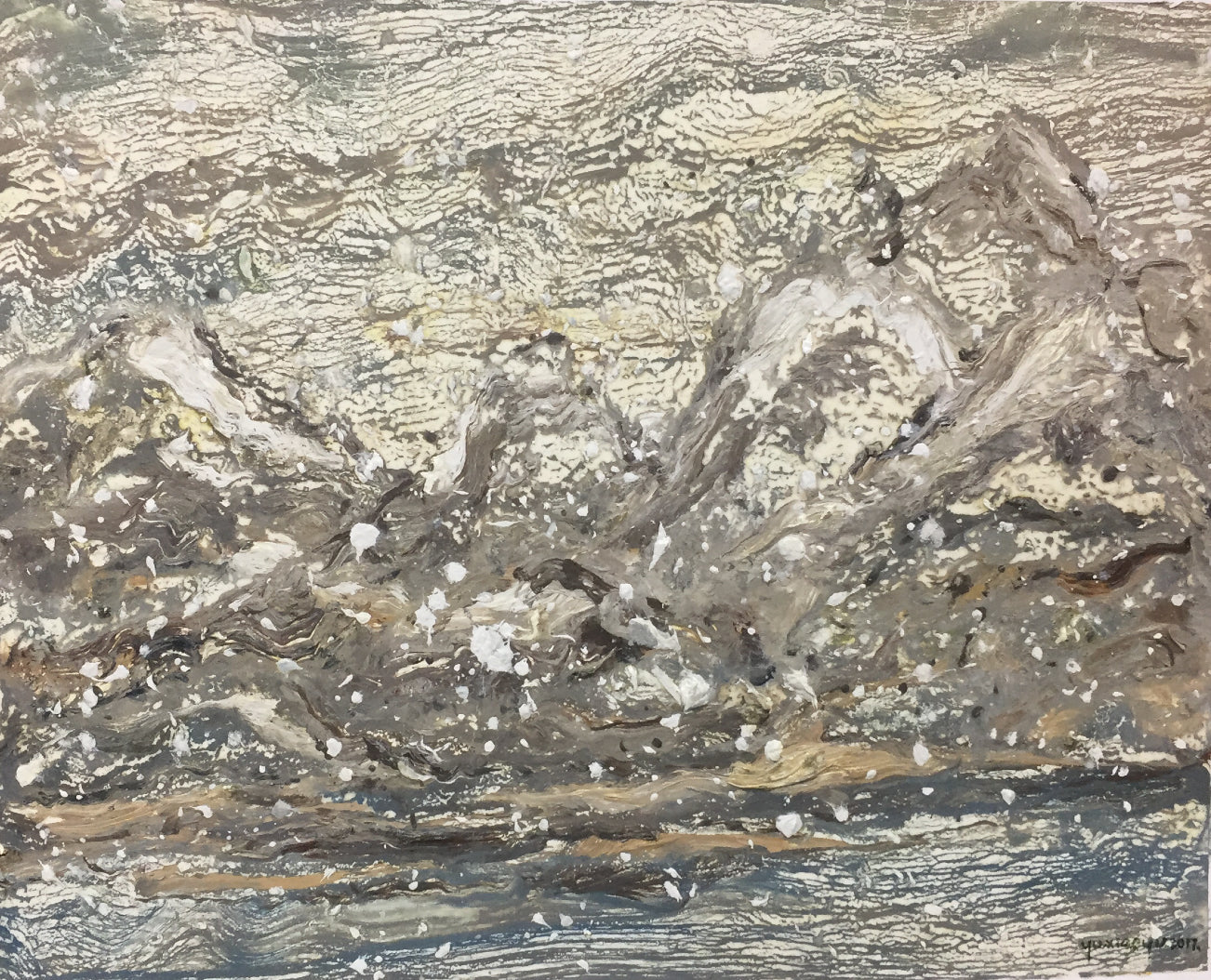Snow by Yu Xiaoyu is a striking abstract landscape rendered in oil on paper. With its textured impasto and swirling palette of earthy whites, greys, and icy blues, the work evokes a snowstorm’s intensity across a mountainous terrain. Thick, expressive brushstrokes and gestural layering create a tactile surface that transforms the flat support into a sculptural experience.