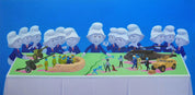 38th Line between North and South Korea is an oil on canvas by contemporary Chinese artist Cao Jicai, measuring 80 x 160 cm. The painting presents a surreal and satirical scene in which a group of near-identical, Smurf-like figures—distinguished by their iconic white hats—gather around a table orchestrating a miniature battlefield. The diorama represents the geopolitical division of the Korean Peninsula, complete with tanks, soldiers, helicopters, and trenches. With its cartoonish characters and toy-sized war theatre, the work explores the absurdity and detachment of military strategy in a hyper-stylized, almost childlike visual language.