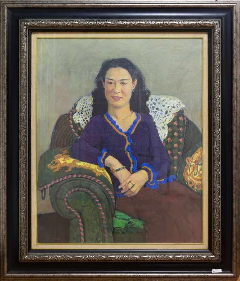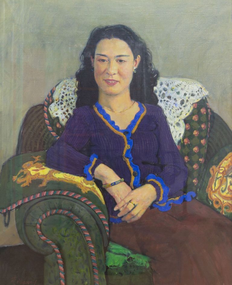 Tender is a finely composed oil portrait by Xin Dongwang, measuring 61 × 80 centimeters and presented in an elegant gilt frame. The painting depicts a seated woman, composed and serene, resting comfortably in a richly upholstered armchair. The sitter wears a deep purple jacket accented with vibrant cobalt blue trim, set against a dark brown skirt. Her relaxed posture—one arm draped along the armrest and the other resting gently on her lap—conveys both quiet confidence and contemplative grace. Behind her, crocheted lace and floral cushions subtly enhance the textural complexity of the setting. The artist’s mastery of figuration and color harmonies is immediately apparent in the balance between the subject’s delicate facial expression and the lush decorative environment.