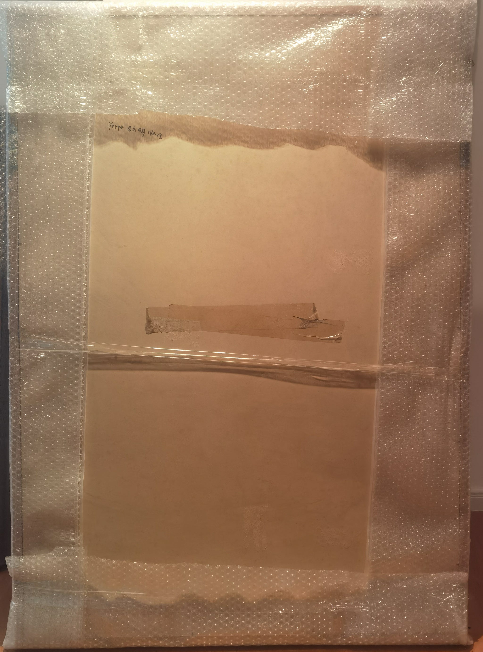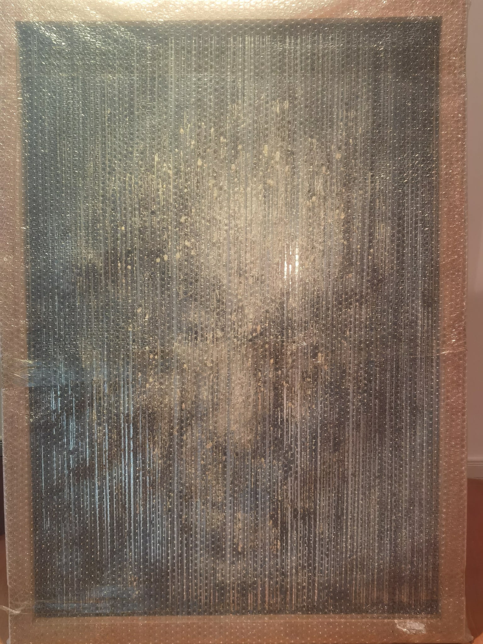 The work is in very good condition. The paint surface is stable, with no visible craquelure, fading, or structural issues. The texture of the layered vertical lines is crisp and luminous under exhibition lighting, with the gilded elements retaining their brilliance. The frame is likewise in excellent condition.