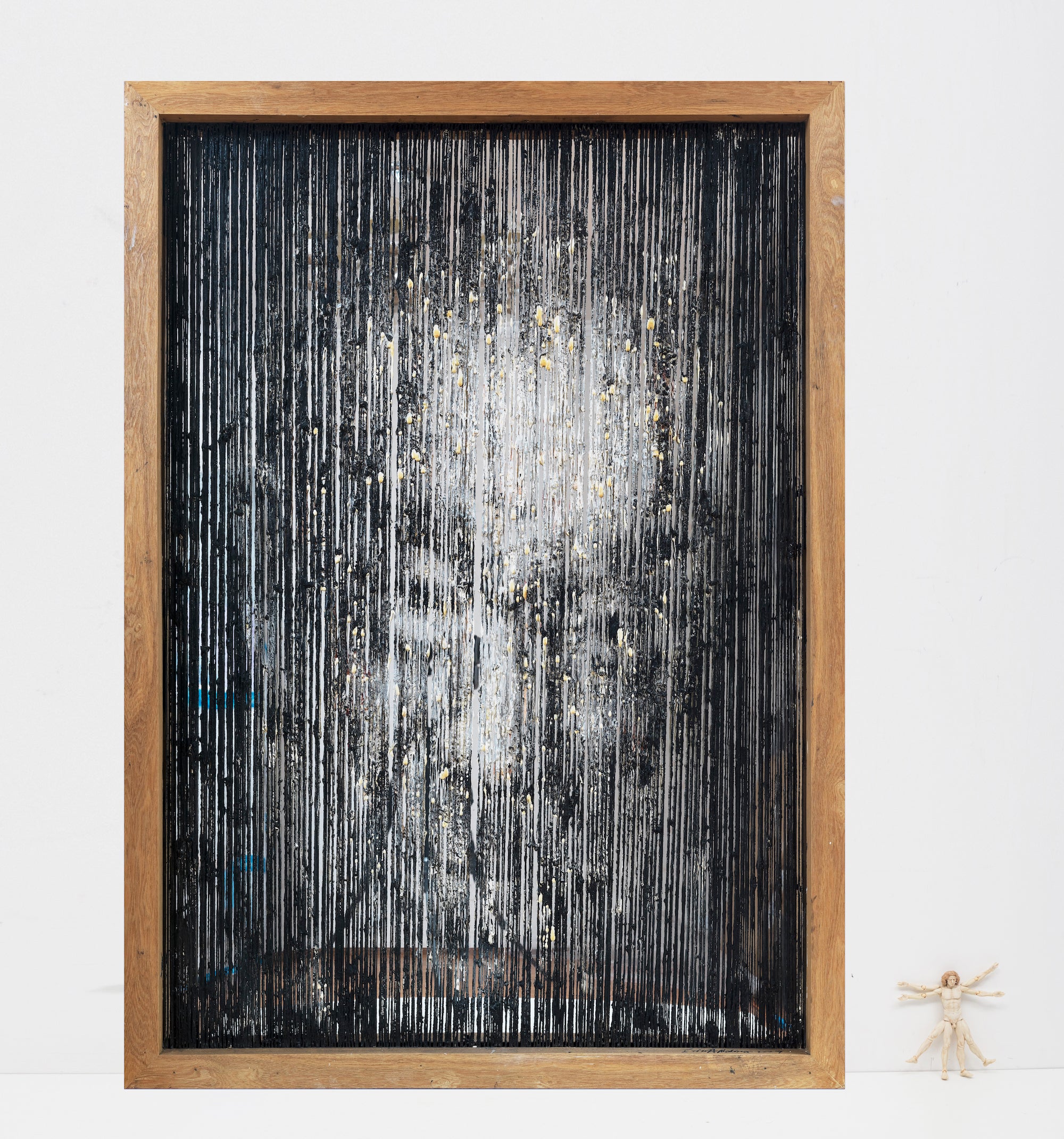 NO.13 is a striking oil painting by Ma Liuming, a pioneering figure in Chinese performance art. Executed on a large vertical canvas, the work features a haunting visage emerging through a dense matrix of vertical strokes in black and white, interspersed with gold accents. The image appears veiled or refracted, as if viewed through a curtain of cascading lines, offering only a partial glimpse of the face beneath. This elusive composition lends the piece a sense of psychological depth, evoking both introspection and concealment.