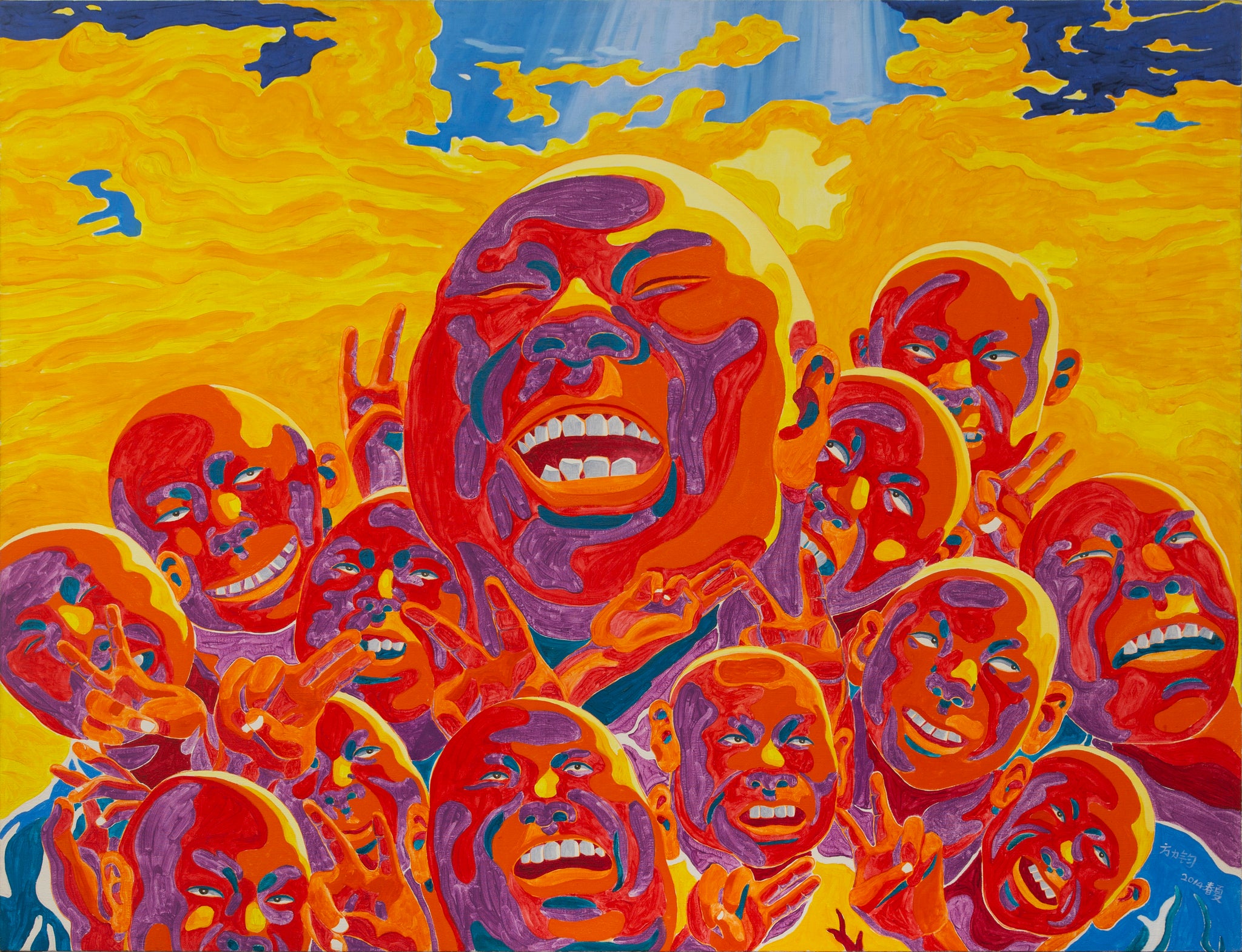 Early Summer of 2014 by Fang Lijun is an oil painting measuring 140 × 180 cm. The work features the artist's signature bald-headed figures, rendered in vibrant hues, set against a dynamic background. The composition reflects Fang Lijun's exploration of themes such as individualism and collective identity within contemporary Chinese society.
