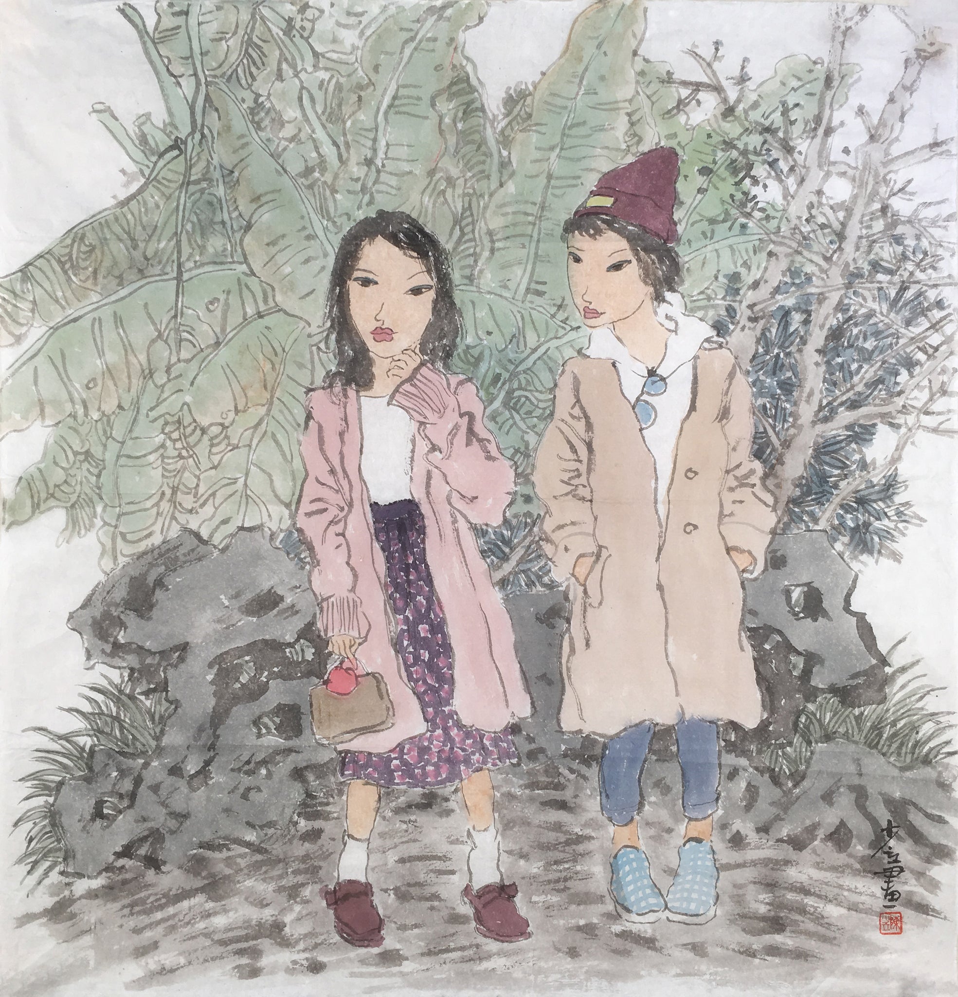 Chen employs a light, deft brush to evoke texture in both fabric and foliage, balancing his figures’ stylized features with the natural softness of watercolor. Drawing from the Chinese gongbi tradition as well as contemporary illustration aesthetics, he skillfully highlights fashion as a form of self-expression. The muted palette and linear ink work create a contemplative atmosphere in tune with the piece’s Title:.
