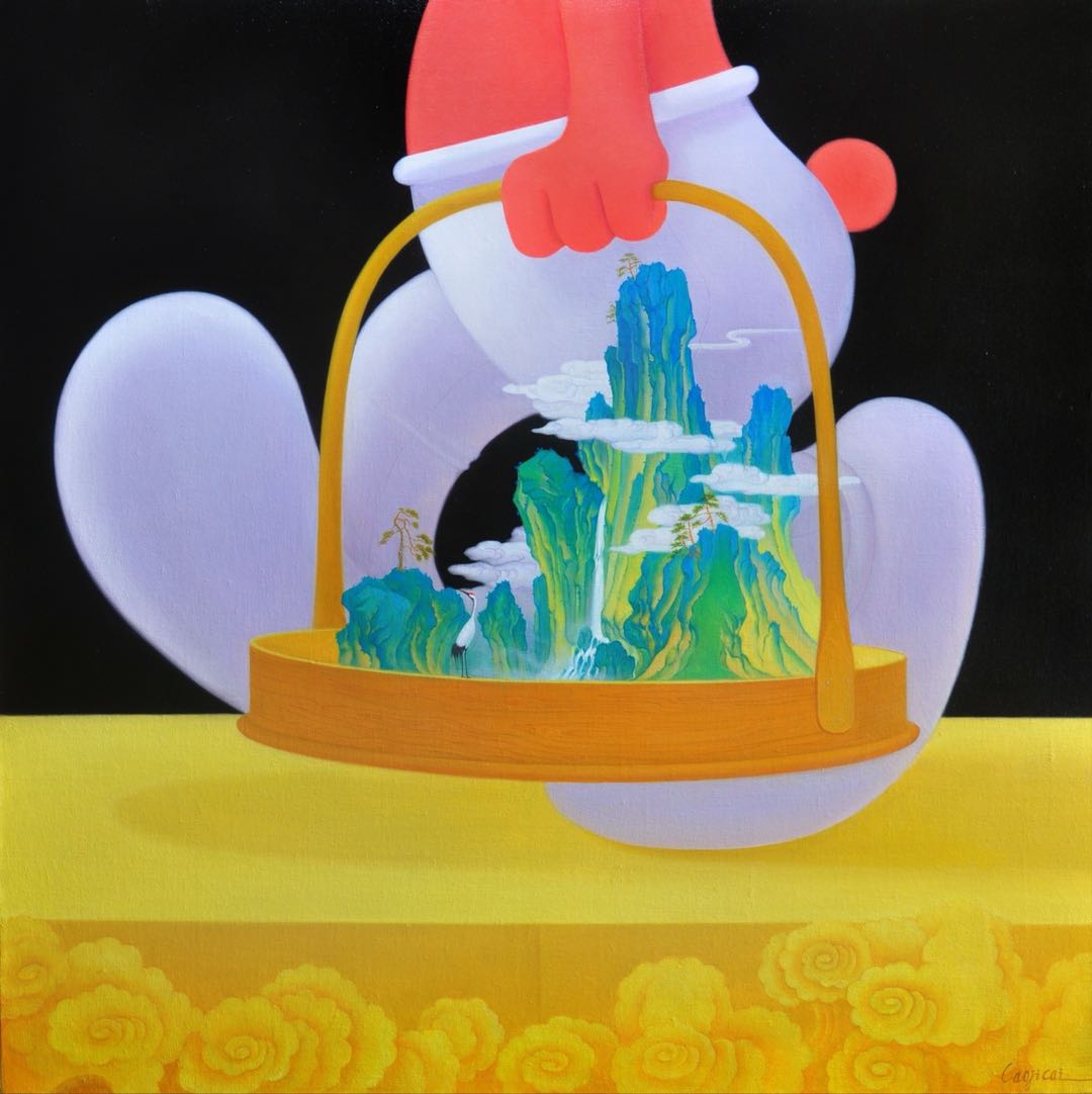 Le in the Landscape is a whimsical and highly stylized oil painting by Chinese contemporary artist Cao Jicai. Dominated by smooth forms and vibrant color contrasts, the work presents a playful figure holding a miniature landscape scene—complete with towering, craggy green peaks and floating clouds—inside a golden basket. The image fuses elements of traditional Chinese shan shui painting with a bold, cartoonish sensibility.