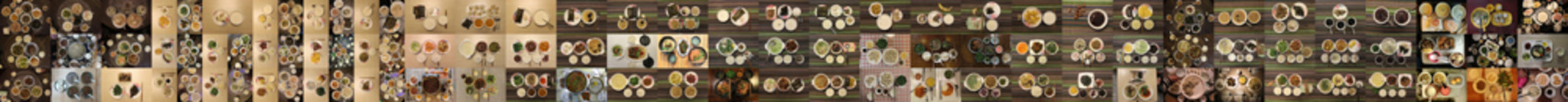 Have a Seat by Minjie Zhang is a long horizontal print measuring 200 x 27 cm. The composition features multiple dishes meticulously arranged on a table, rendered in a repetitive sequence that emphasizes rhythm and visual continuity. The piece reflects both aesthetic simplicity and cultural familiarity, drawing attention to the communal act of dining.