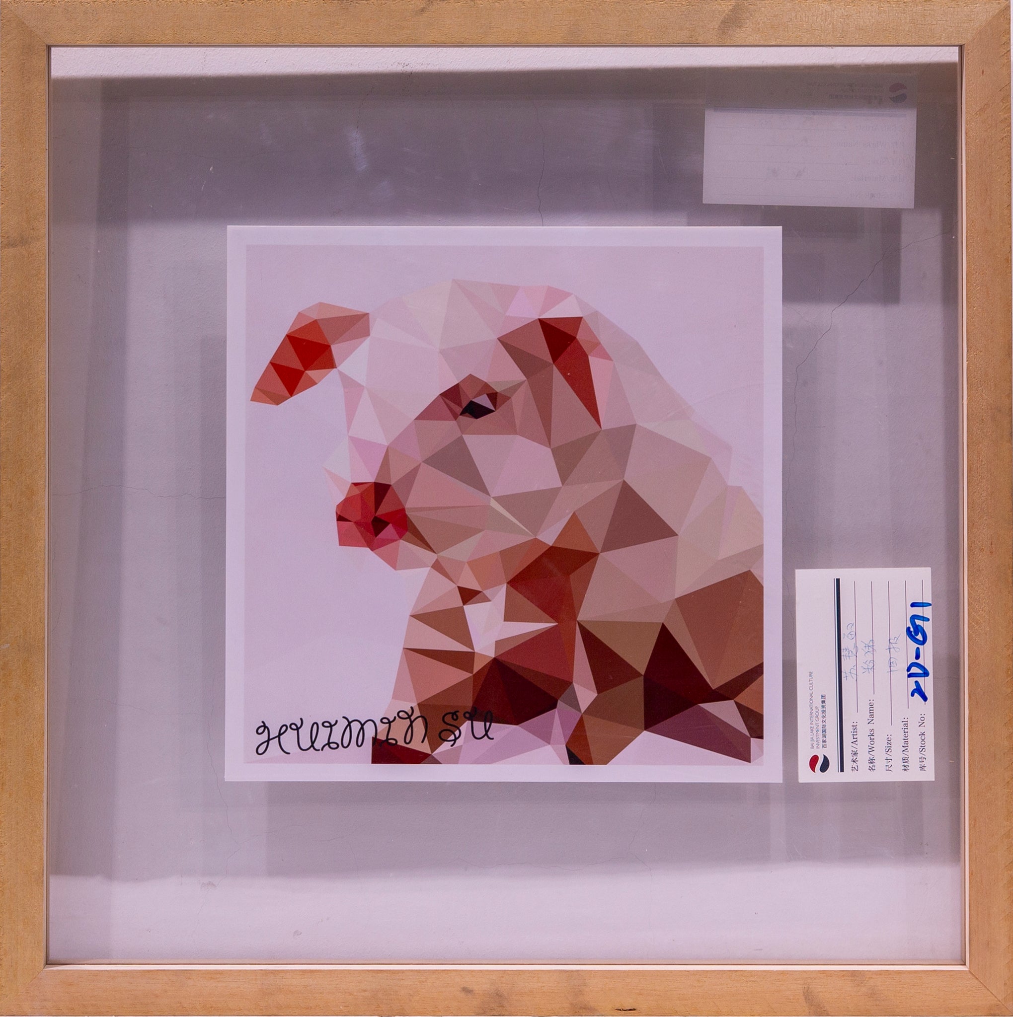 Pink Pigs by Huimin Su is a digitally rendered geometric print that depicts a stylized piglet composed entirely of angular polygonal planes in shades of rose, cream, brown, and crimson. Set against a clean white background and neatly framed, the subject’s soft and curious expression is distilled into a kaleidoscope of crystalline facets, resulting in a visually striking and contemporary portrayal of animal innocence.