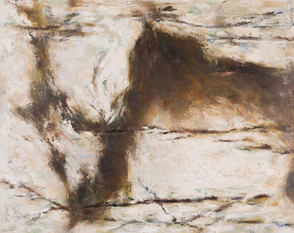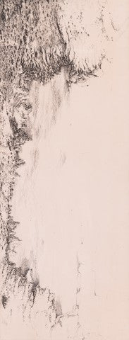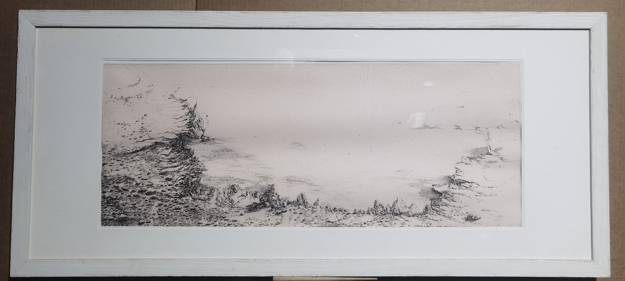 Walker Bu Ju is a contemplative print by Caizhen Wang, executed in a soft monochromatic palette that captures a panoramic, almost dreamlike terrain. The delicate landscape unfolds horizontally with detailed brush-textured formations flanking both edges, suggesting rugged cliffs or eroded coastlines. The vast, open central space draws the viewer into a moment of stillness, framed within a refined white mat and minimalist white frame.