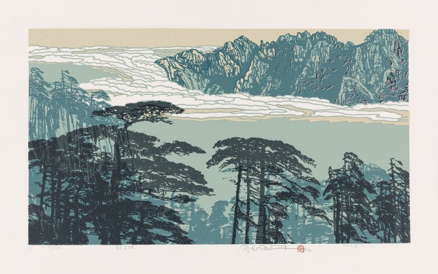 The work fuses traditional Shan Shui (mountain-water) aesthetics with a modern printmaking sensibility. The crisp delineation of rock forms and controlled color palette echo the discipline of Chinese woodblock traditions, while the atmospheric layering retains the philosophical depth of classical ink landscapes. Guolin Zhang’s approach exemplifies the dialogue between heritage and innovation in contemporary Chinese art.