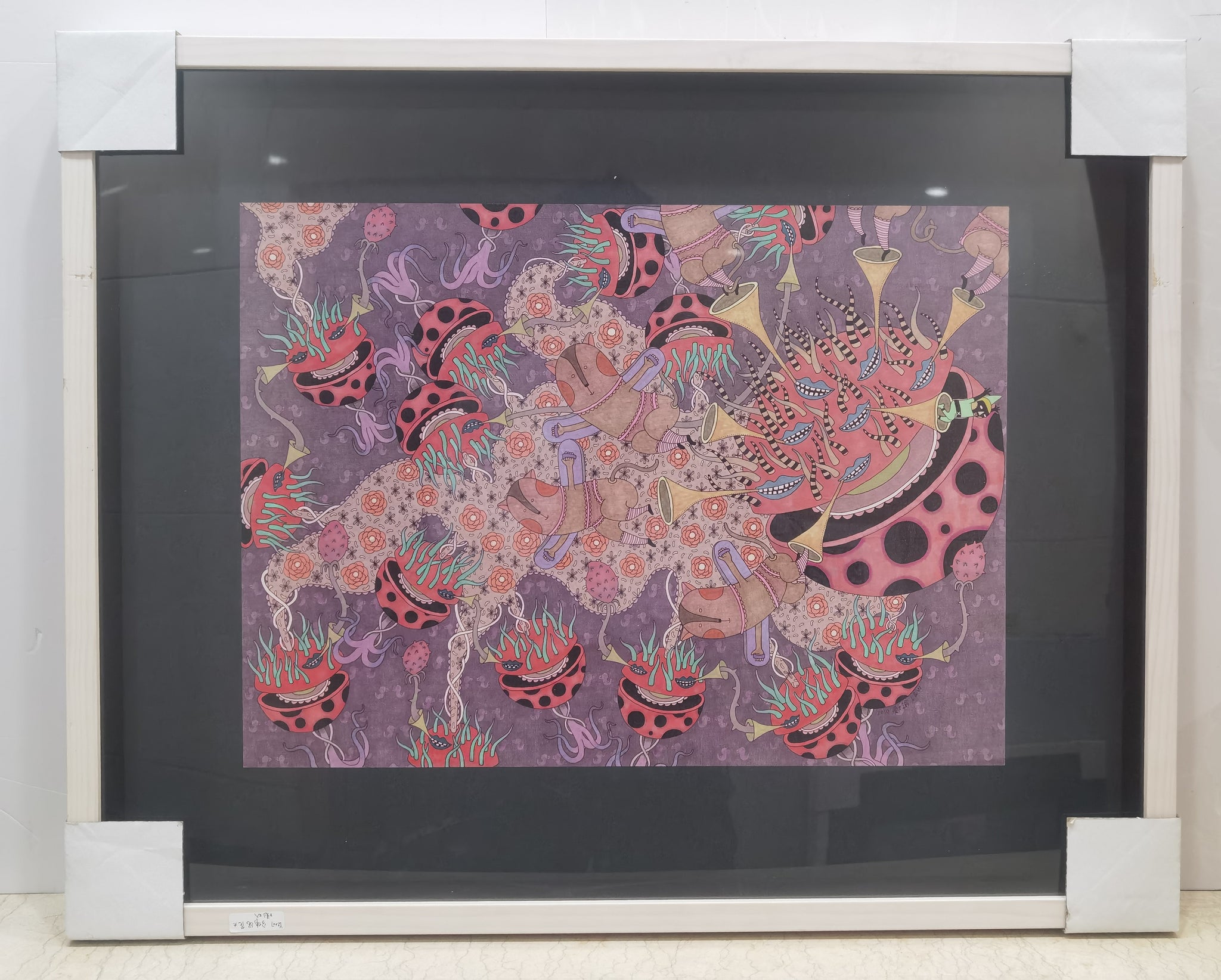 Split Body Says Flower Big Horn is a vividly imaginative collaborative work by Taiwanese artists LIN Yu-Ching and WEI Hsin-Yu. This meticulously executed print features a swirling arrangement of surreal, floral-organic forms rendered in vibrant pinks, purples, and reds. Recalling microscopic life, psychedelic botany, and ceremonial textiles, the composition unfurls with kaleidoscopic intricacy, evoking both chaos and cosmic harmony. The work belongs to their ongoing exploration of mythical dreamscapes featuring the artists’ recurring avatar figure, “Wulala.”