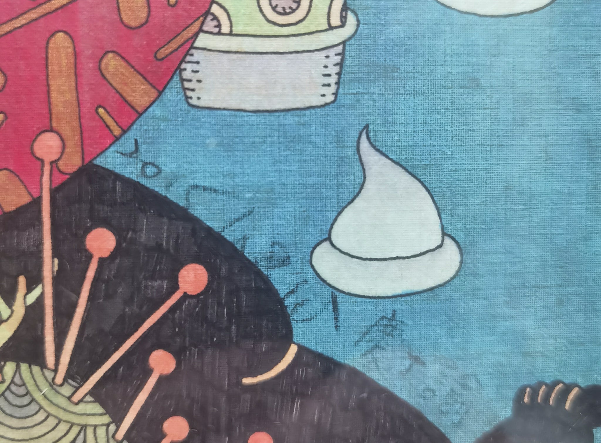 The print exhibits the artists’ signature stylistic blend: delicate line work, vibrant pastel palettes, and rhythmic compositions that echo both traditional Asian murals and modern graphic illustration. Their command of micro-patterning, harmonious tones, and layered symbolism creates a mesmerizing, almost meditative effect—one where emotional introspection meets visual narrative. The influence of Japanese manga, digital aesthetics, and folk ornamentation is subtly interwoven into the composition.