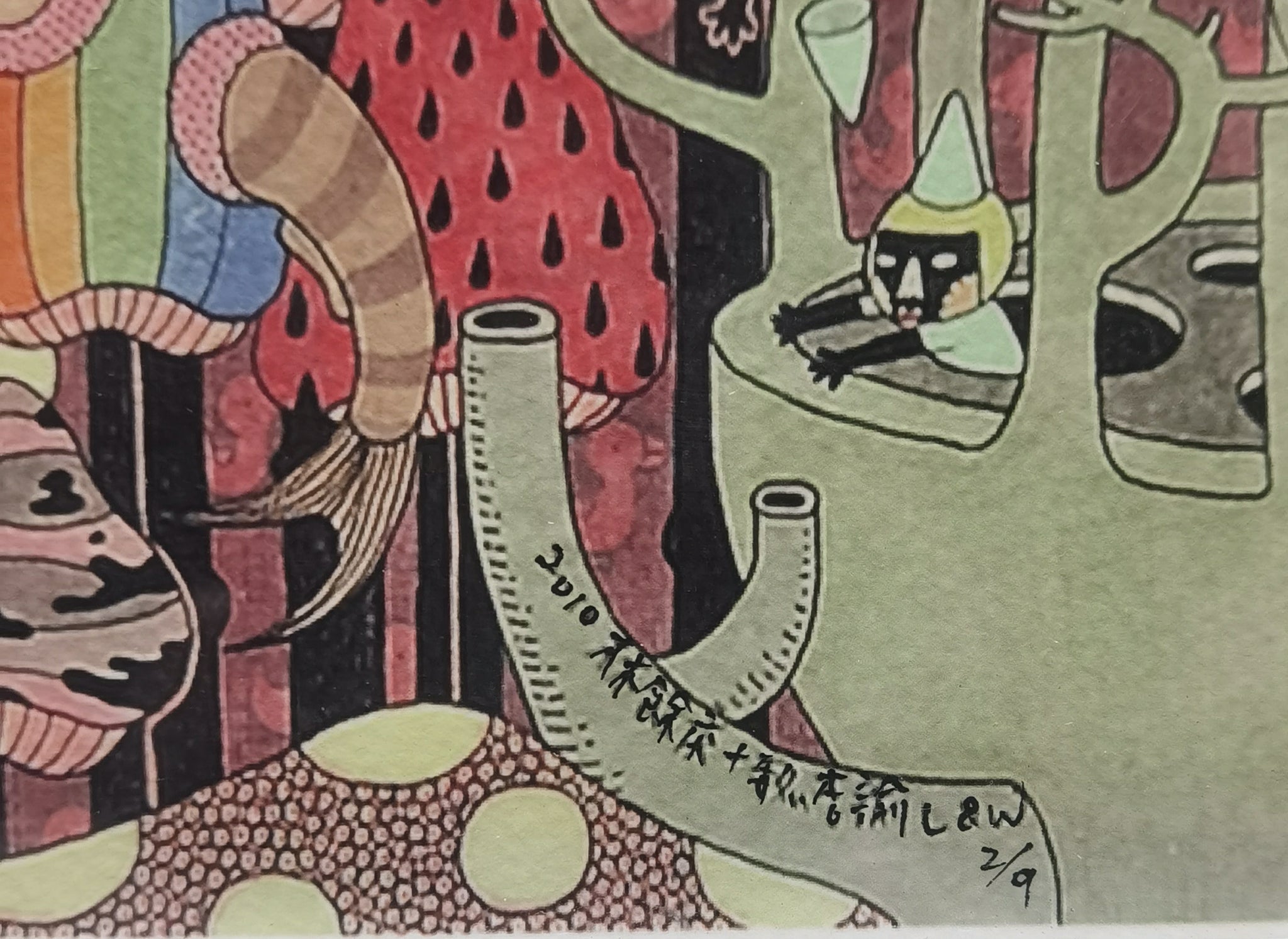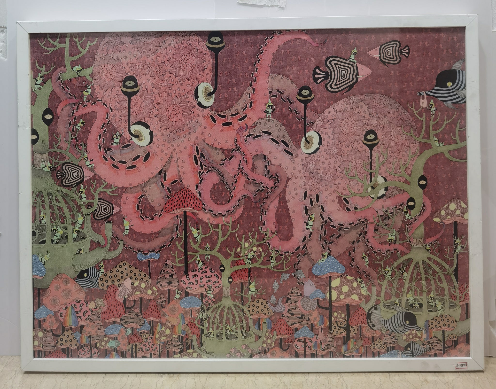 This Untitled 2010 print by the Taiwanese artist duo LIN Yu-Ching and WEI Hsin-Yu presents a fantastical underwater dreamscape dominated by a large, intricately detailed pink octopus. The composition teems with stylized coral forms, mushroom-like growths, exotic fish, and surreal botanical structures, forming a lush, rhythmic tapestry that evokes both the beauty and complexity of marine ecosystems.