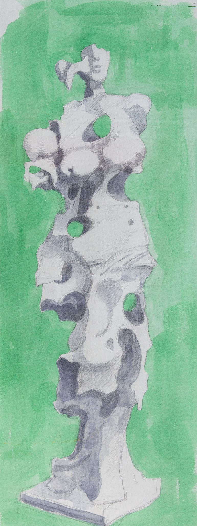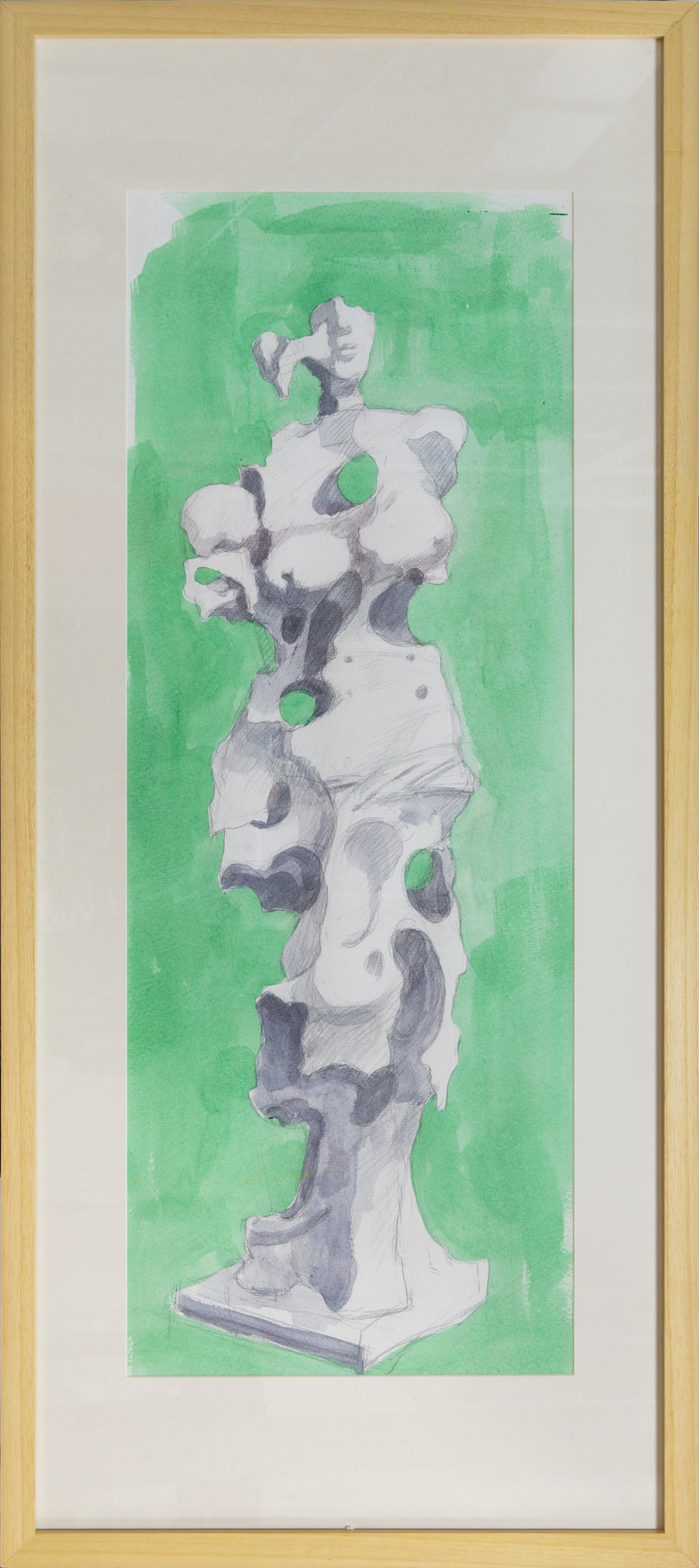 Venus of Taihu Lake is a delicately executed watercolor and pen drawing by Chinese artist Sun Guanghua, measuring 80 x 40 cm. The piece portrays an abstracted, eroded stone form evocative of both classical statuary and naturally weathered rock — a lyrical fusion of human form and geological structure. The central figure stands silhouetted against a wash of verdant green, its porous, organic shape suggesting both sensuality and the timeless passage of natural forces. The work is presented under glass in a light wood frame. It remains in very good condition.