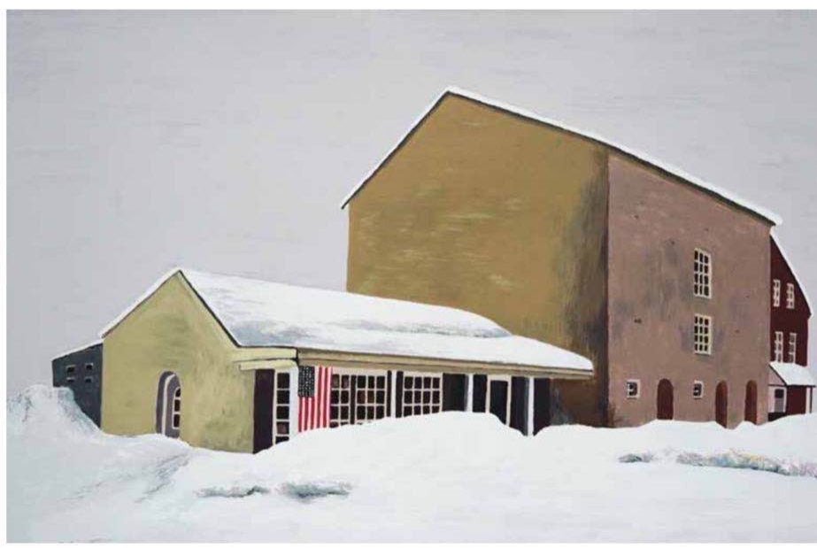 In Silence, Liu Gangshun presents a stark, snow-covered American-style building under a pale winter sky. The subdued tones and geometric simplicity of the architecture are softened by the snowdrifts that engulf the structure. A lone American flag hanging in the porch area provides a quiet but pointed accent of color and identity.