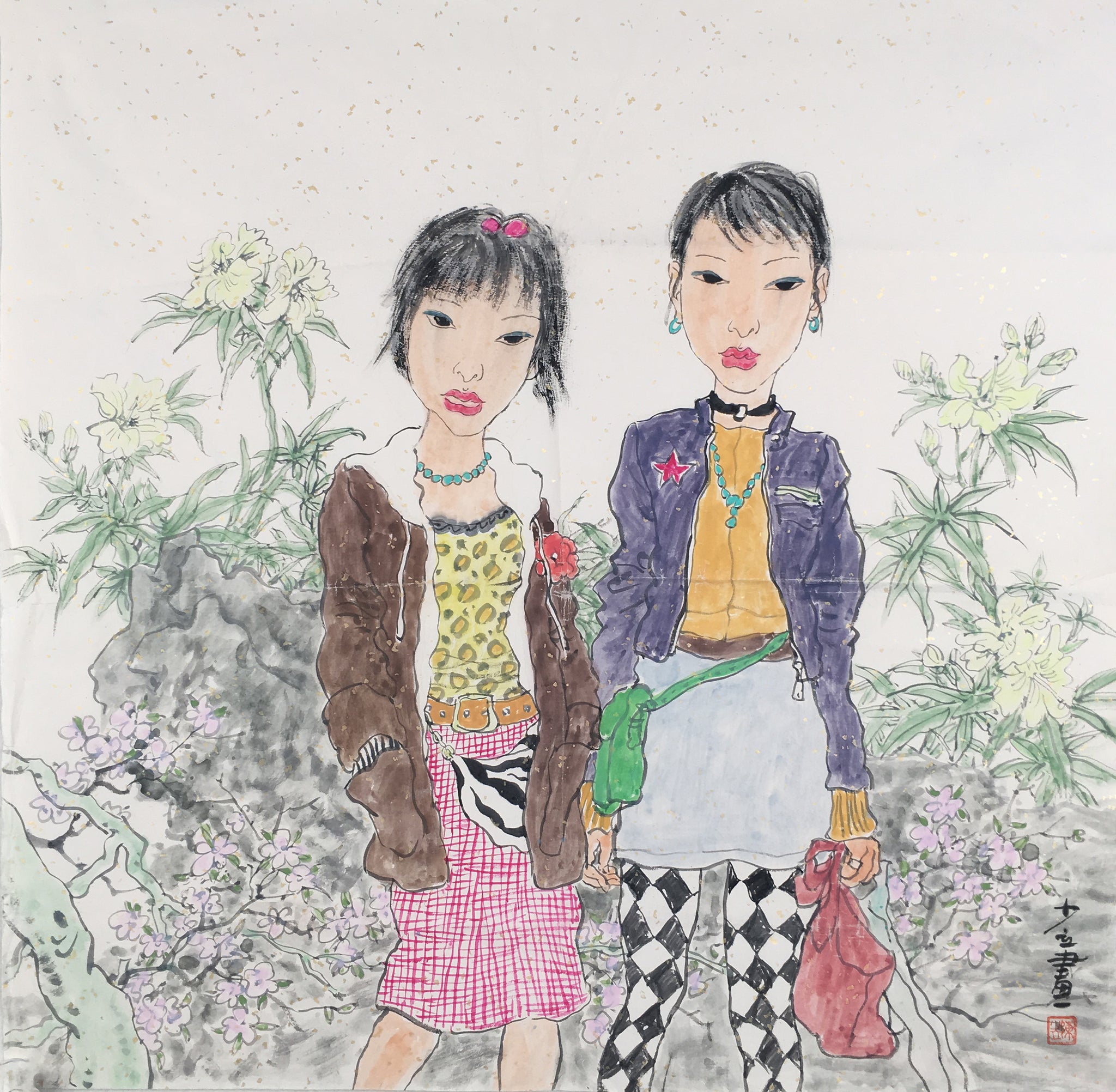In Fashion, Shaoli Chen once again turns his attention to the vibrant expressions of youth. This ink and watercolor composition features two stylish young women posed confidently against a backdrop of blooming flora and textured rock. Dressed in eclectic, boldly layered outfits—featuring animal prints, plaid, statement jewelry, and mismatched accessories—their outfits reflect individuality and a playful defiance of conventional fashion norms.